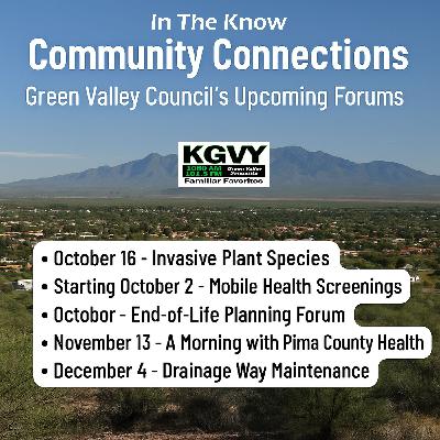 The Green Valley Council is gearing up for a busy season of community forums and programs, and President Debbie Kenyon joined Andy Taylor to share the details. Coming up on October 16th, local expert Ben Tully returns with an important session on invasive plant species and their impact on wildfire safety. Also starting October 2nd, residents can take advantage of monthly mobile health screenings, including blood pressure checks, diabetes testing, and more. October also features the popular end-of-life planning forum with the Pima Council on Aging, giving families the tools they need to prepare for the future.Looking ahead, “A Morning with Pima County Health” takes place on November 13th, focusing on valley fever, rabies, seasonal flu, and respiratory illnesses. On December 4th, a drainage way maintenance forum will help HOAs and residents understand how to reduce flooding and wildfire risks, and on January 15th, the Pima County Assessor will share information on fraud alerts and relief programs for veterans, widows, and widowers. With so many opportunities to learn and connect, these programs are designed to keep Green Valley residents informed, prepared, and supported.