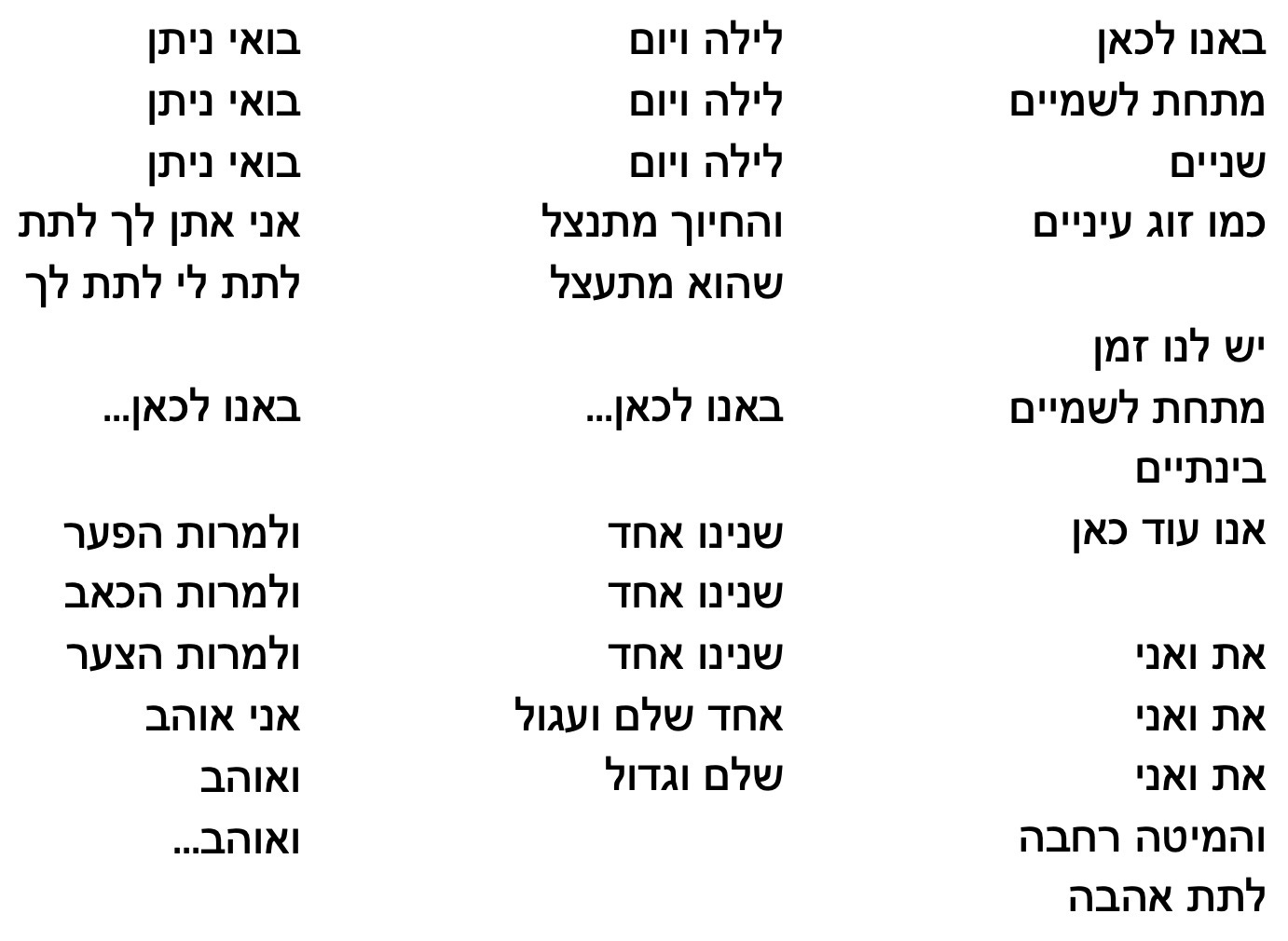 Here is the song (words by Meir Ariel, melody by David Broza, two of Israel’s musical giants) first in Hebrew, then in English from LyricsTranslate).