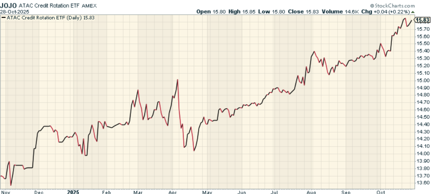 Enter the ATAC Credit Rotation ETF (ticker: JOJO). This fund operationalizes that tactical mindset through a rules-based “Credit-On / Credit-Off” framework. Rather than remaining static, JOJO rotates between two opposite exposures: high-yield corporate bonds in risk-on periods and U.S. Treasuries when conditions turn defensive. Its signal derives from the relative strength of utilities stocks versus the broader equity market—a relationship that has historically foreshadowed volatility. When utilities outperform, JOJO shifts into Treasurys; when they lag, it re-engages high-yield exposure.