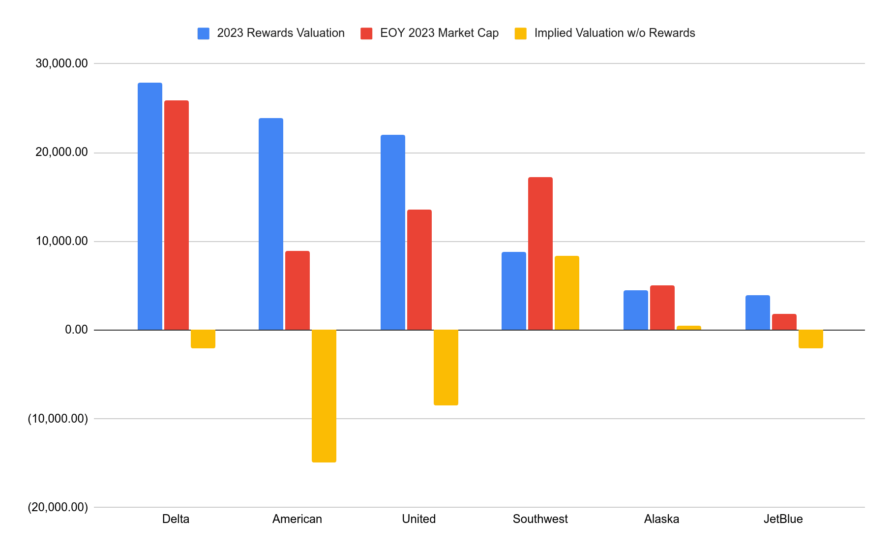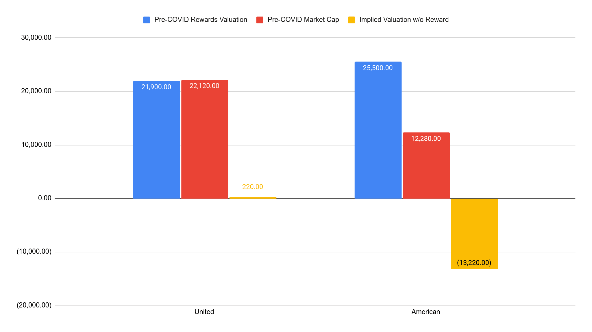 - During COVID, many US major airlines applied for loans under the CARES Act. Some of them used their rewards programs as collateral for these loans, and both United and American publicly disclosed their reward programs' appraised values for this purpose.