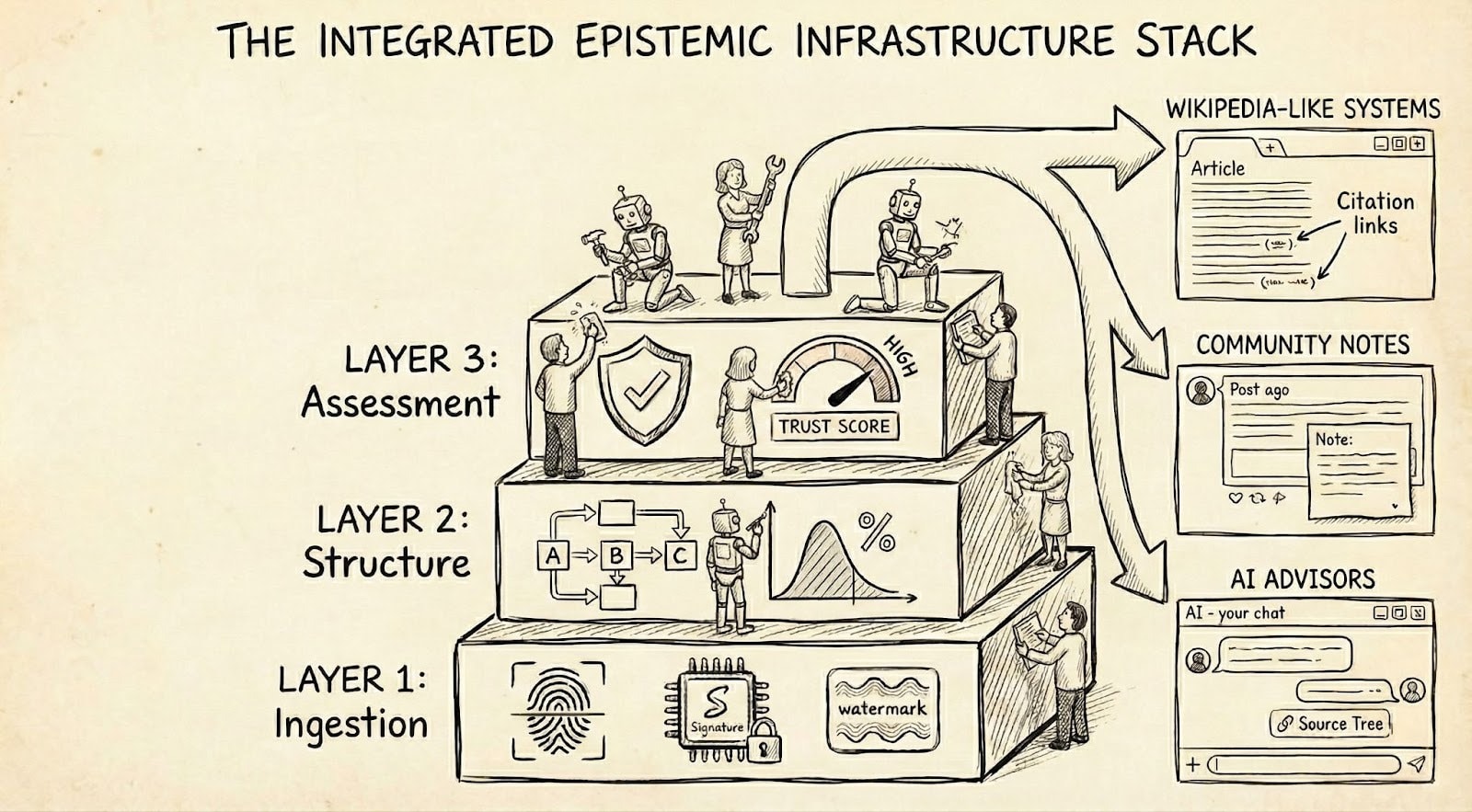 Diagram showing three-layered epistemic infrastructure stack with connected Wikipedia-like systems, community notes, and AI advisors.