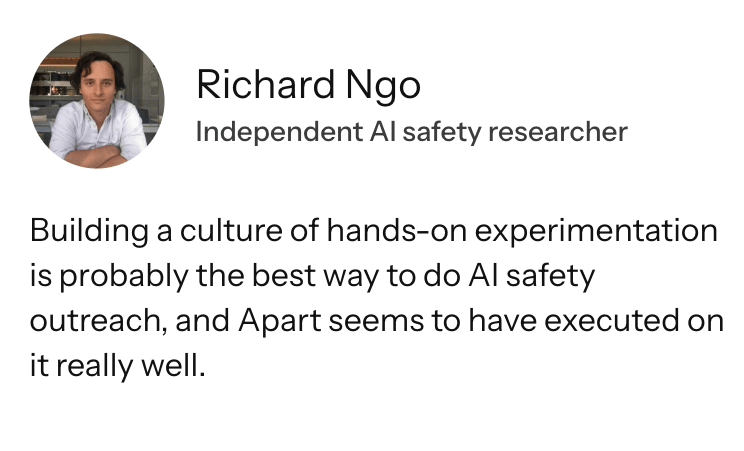 Apart Research is a remote-first AI Safety organisation for field-building and research. We focus on converting technical talent into published AI safety researchers, ready to contribute to impactful organizations. We serve top talent globally, whether they're new to AI safety or looking to deepen their engagement.