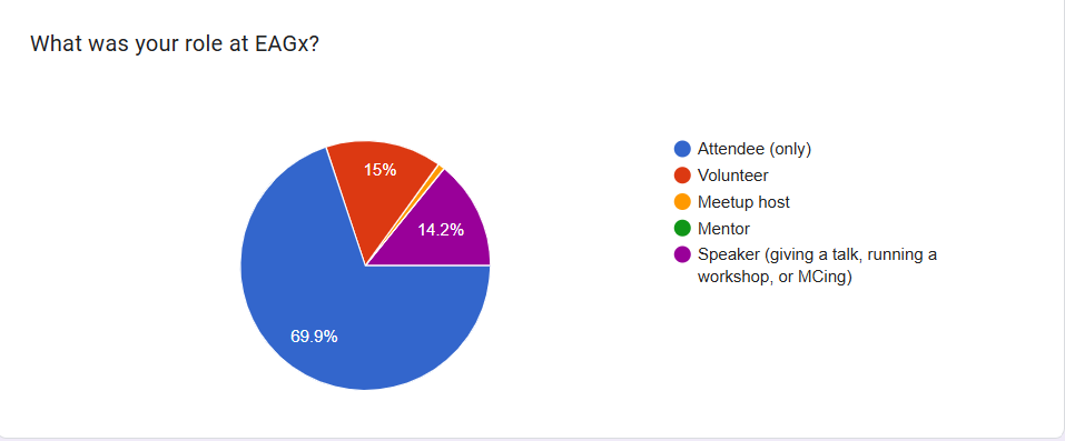 Key InformationAttendance No. of applications received 917No. of approved applications 443No. of attendees who registered on Swapcard 372No. of attendees295No. of volunteers45BudgetTotal event grant$73,350.9Actual expenditure (including staff costs)$61,458.9Travel support$63,653.8Cost per attendee$408.8Team HoursTotal team hours1692.35ContentNo. of sessions (Talks, workshops, and meetups)29