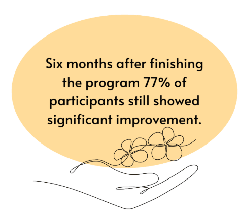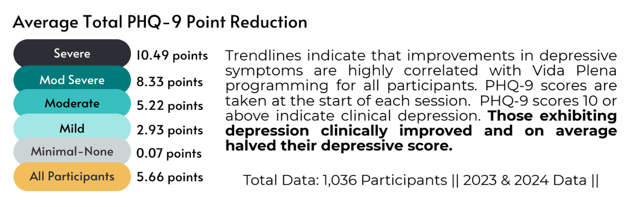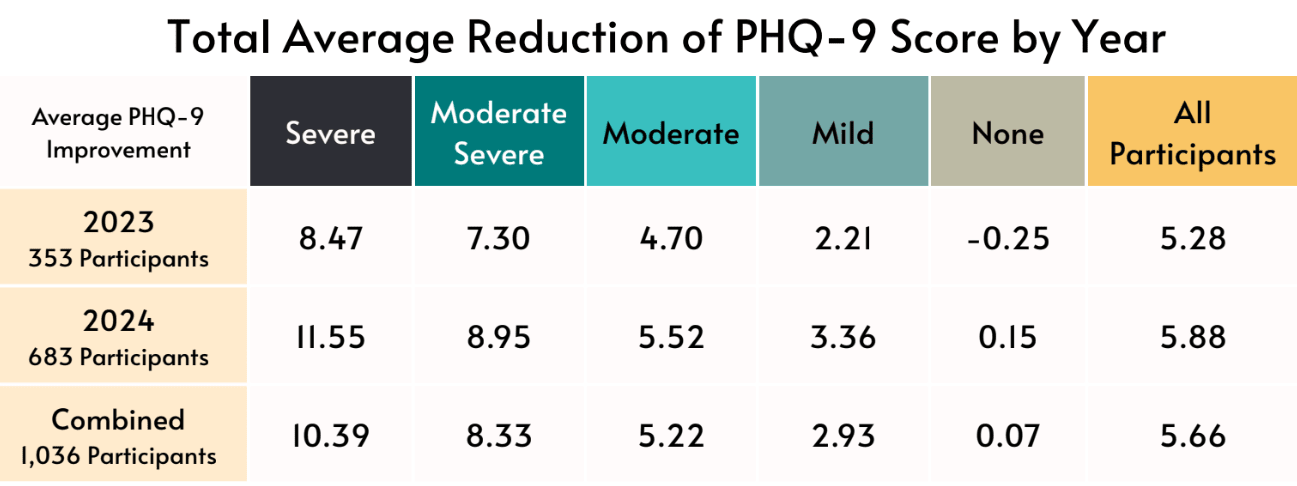 5. Results: 84% of participants improve clinically in depression and anxiety. 82% had reduced suicidal thoughts.