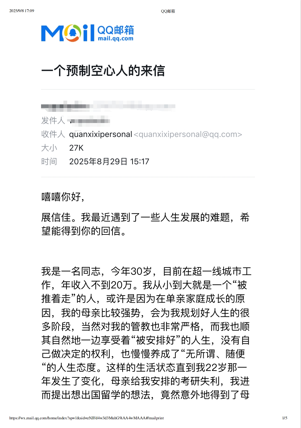 来信邮箱:quanxixipersonal@qq.com每个月回复一封来信,一年会回复12封。前九个月的回信在合集里。关注我,11月回信再见。