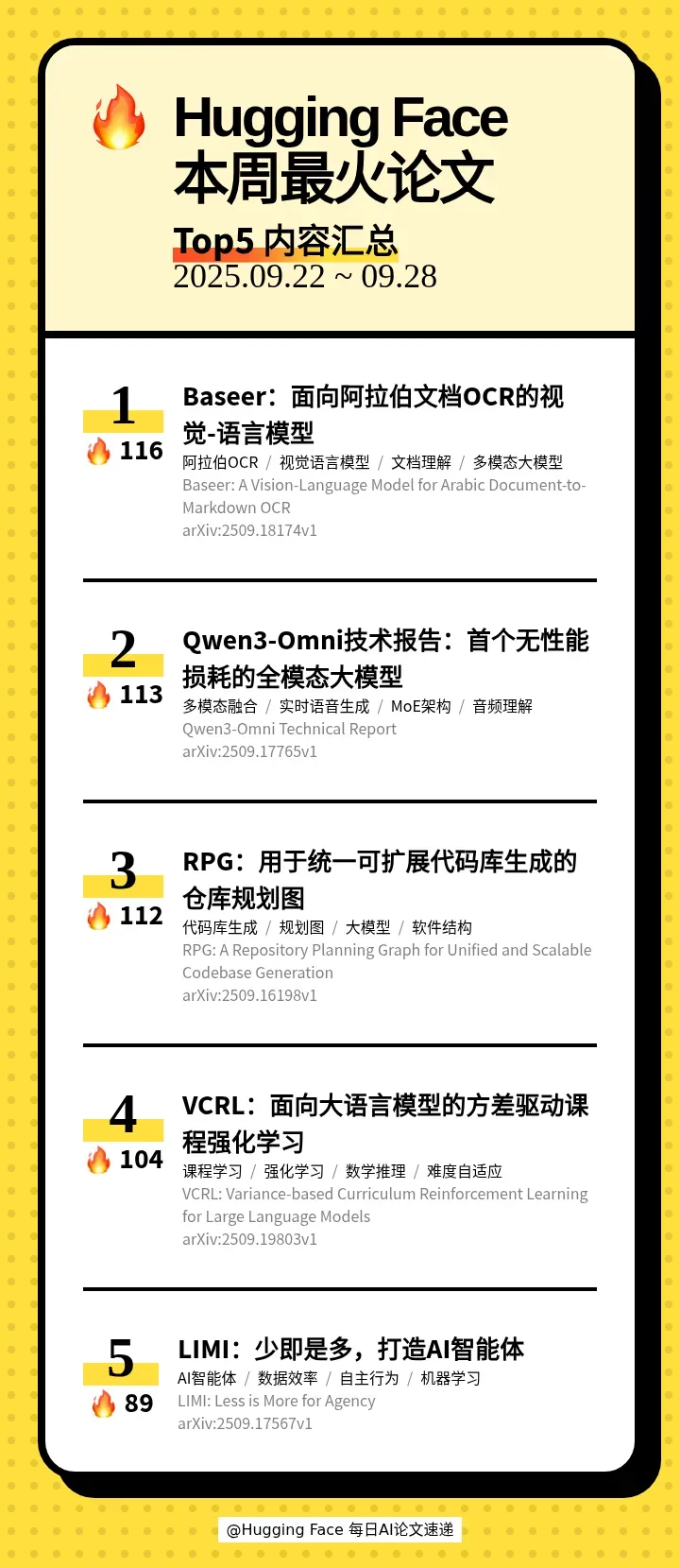 DiscoverHuggingFace 每日AI论文速递【周末特辑】9月第5周最火AI论文 | Qwen3-Omni开源称王; 锁定视觉训解码,Baseer刷新阿文OCR;