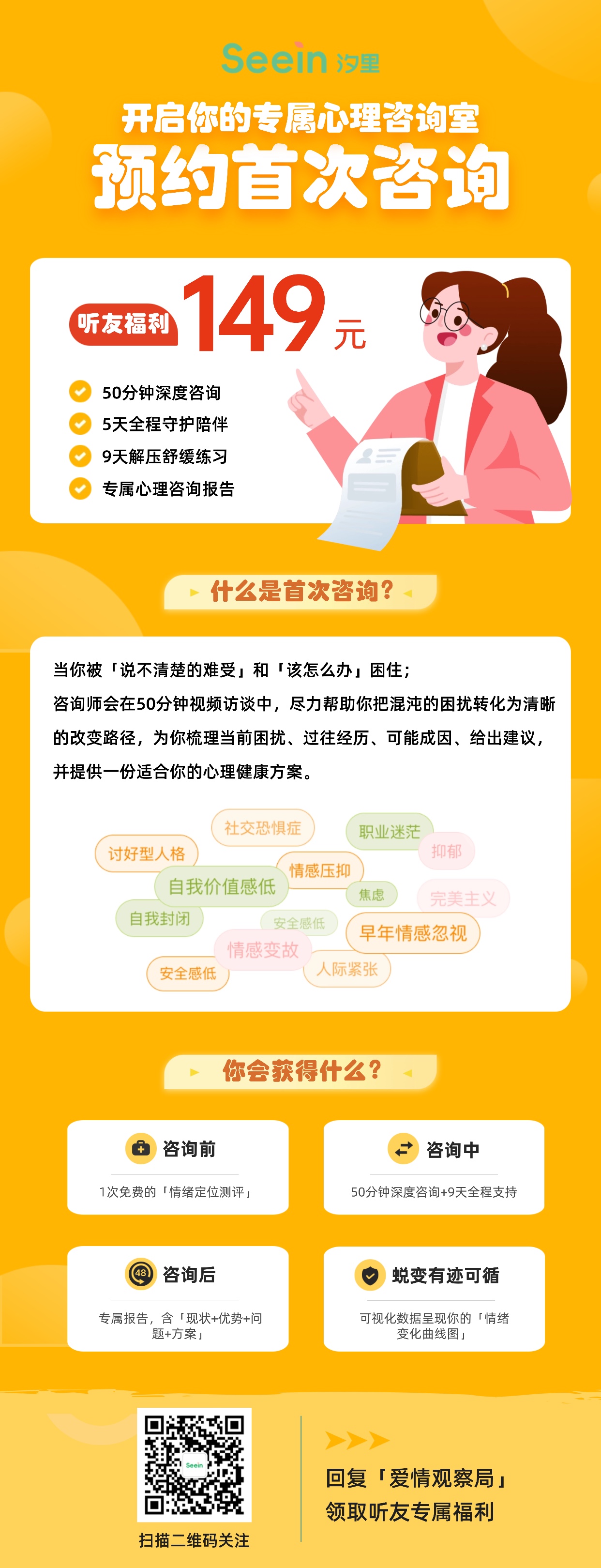 搜索并关注「汐里心理」服务号,回复关键词【爱情观察局】领取专属优惠,原价199首次咨询,立享149粉丝优惠。