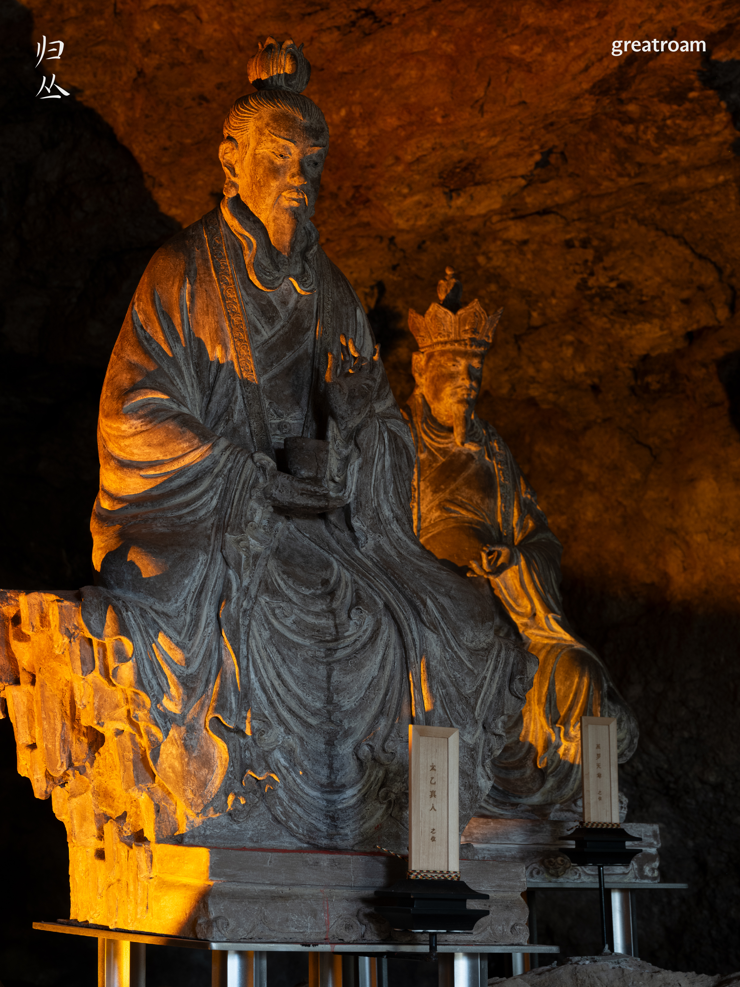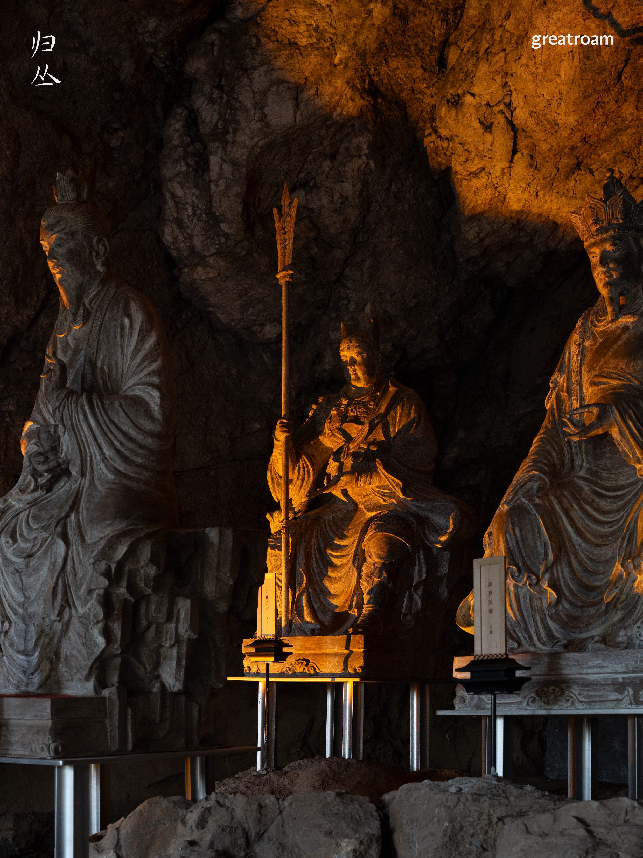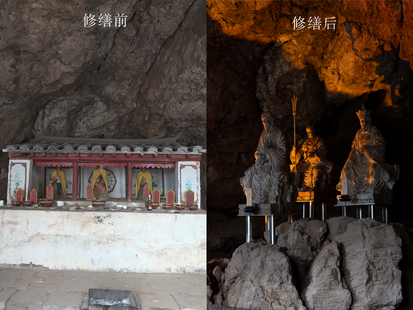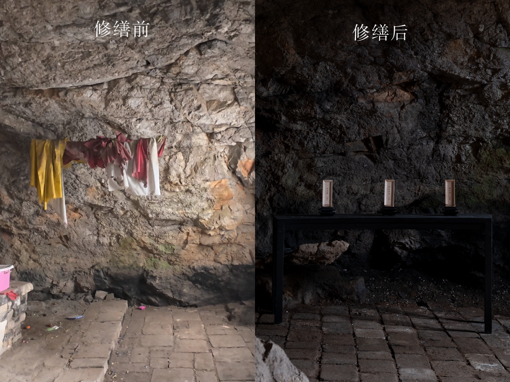 也因为这份敬畏心和使命感,我们保留下了九真洞原本的三尊神像的制式,古师傅亲自驱车往返山西多次,找到山西传统泥塑造像手艺传承人,以山西玉皇庙的造像为灵感,与手艺人一同打磨造像的神韵、形态和岁月感,修旧亦如旧。困难之中也有惊喜,最初我们想把洞内做平,用方柱做展台呈现造像,但拆除原龛位后露出来的凸凹不平的山体,反而是浑然天成的自然景观,也让我们不禁思考,其实山体自己就是最好的样子。它就在那儿,过了几百年,甚至上千年,也许和神明一起庇护人们。于是我们迅速调整方案,把三尊造像打造成在山间修行打坐的效果。