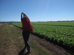 ネギファームにて。ネギのピッキングは時給7ドルくらいで、安いそうです。他の時給の仕事はなんと、16ドルだとか…。