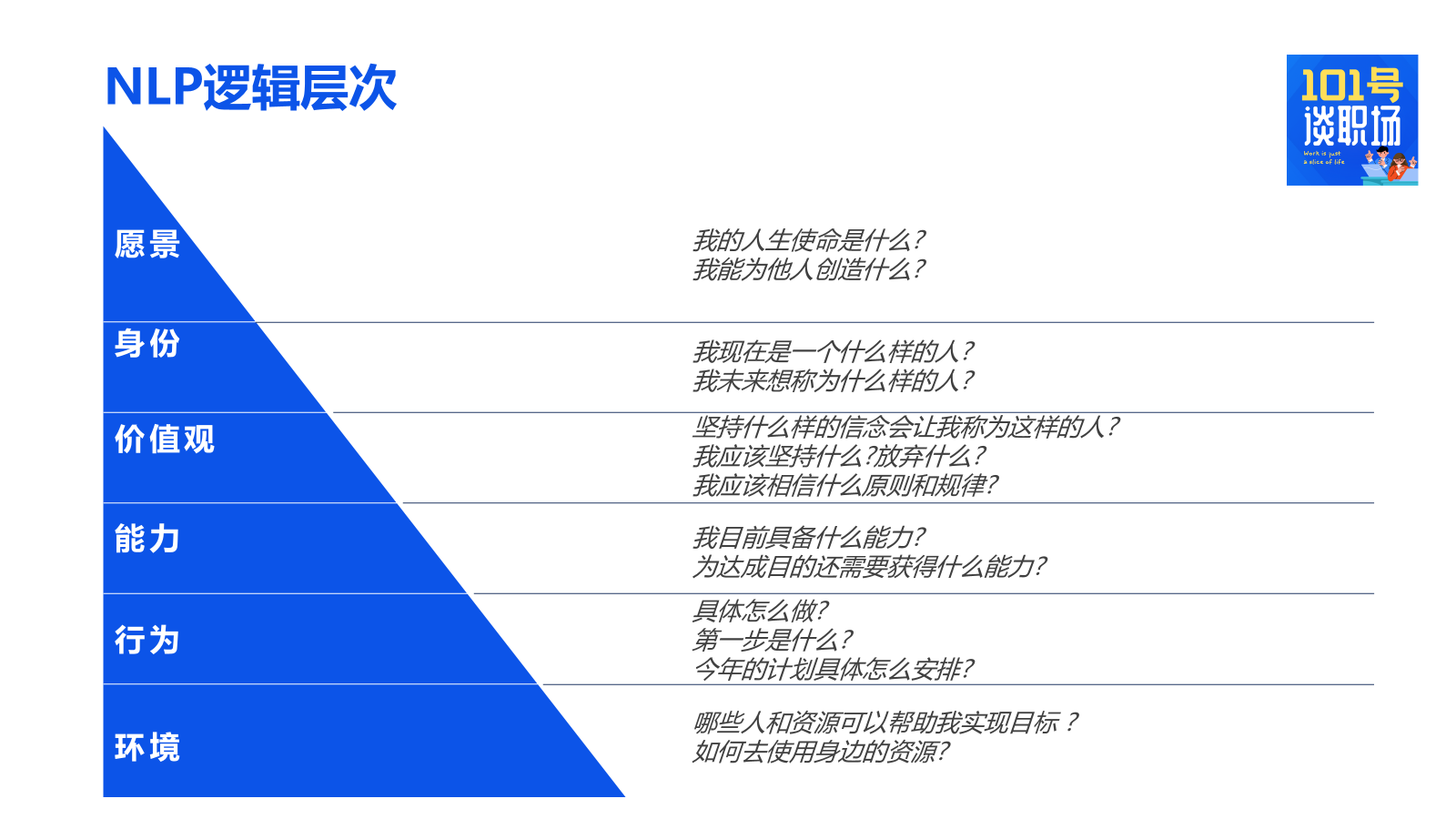 - 核心理论:人类行为动力源于金字塔顶端三层顶层:愿景(人生终极图景)