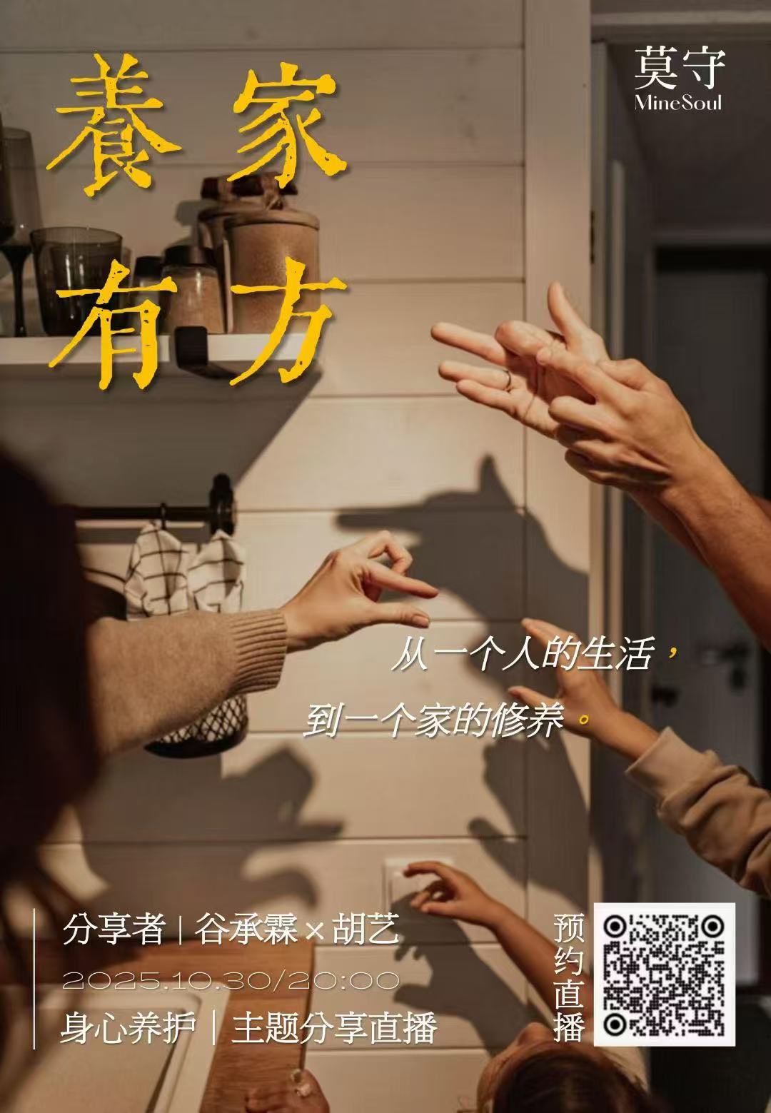“养家有方”是莫守MineSoul与位于杭州西湖区一家茶馆的掌柜——胡艺一起联合推出的节目,我们每个月的最后一周的周四晚上会在莫守MineSoul官方账号上进行直播,同步我们也会把内容发放到各个平台上,希望用我们的视角和体悟与所有“在家”之中的人,能够互相帮助,互为彼此的“砖”,同时也互为彼此的“玉”,没有一个标准,毕竟“吾心安处即吾乡”嘛。