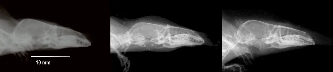 脑袋在冬天会变小的鼩鼱(从左到右分别是冬天前、冬天时、冬天后的头颅X光图):