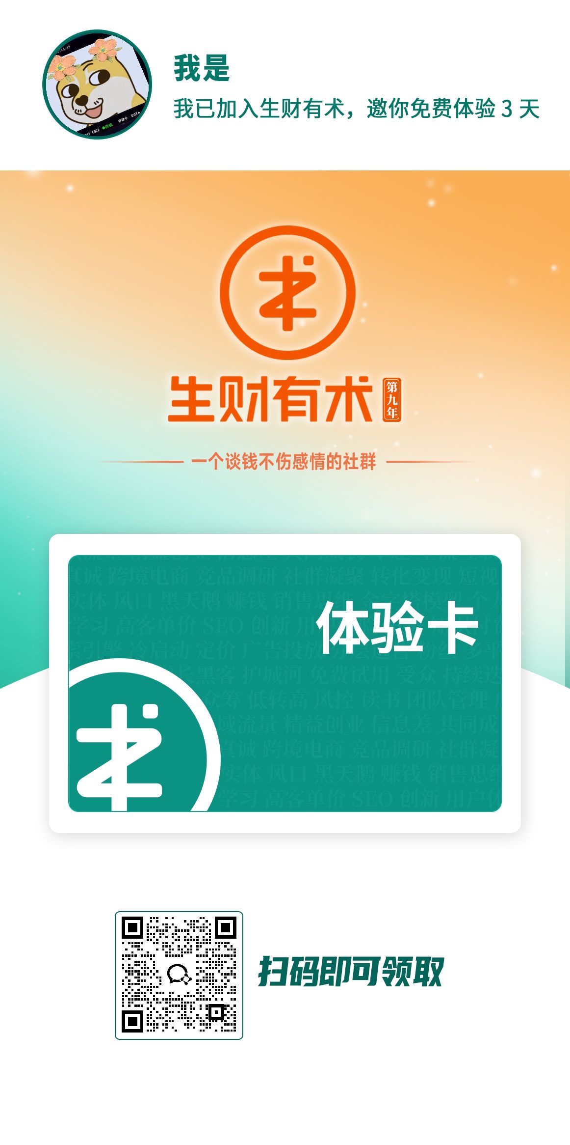 另外,如果大家想进生财有术社群看看,白白送给大家3天免费会员体验,大家扫码添加鱼丸进哦,这是白白花钱买会员送给听友们的白嫖福利,大家放心可冲~