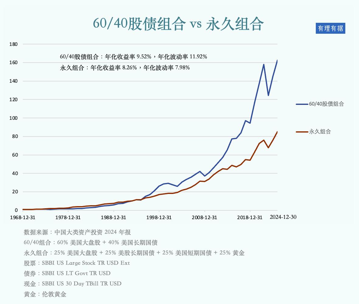 过去近 60 年,60/40 股债组合 与 哈里· 布朗永久组合长期表现概览。