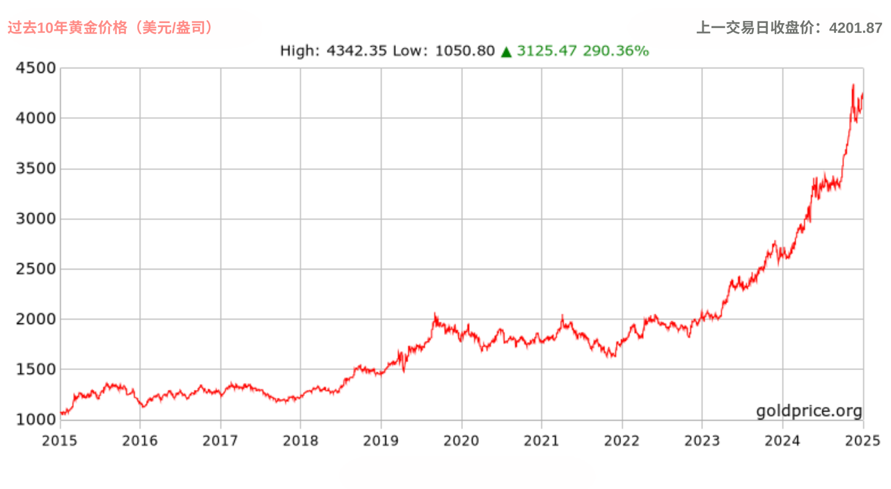 黄金从 2024 年的约 2107 美元跃升至 2025 年 12 月 3 日的 4201 美元,单年涨幅几乎翻倍。
