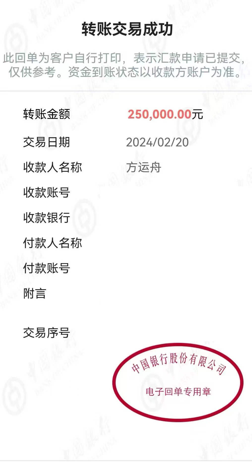 💰  哪吒员工向方运舟个人账户转股权款截图(敏感信息已模糊)