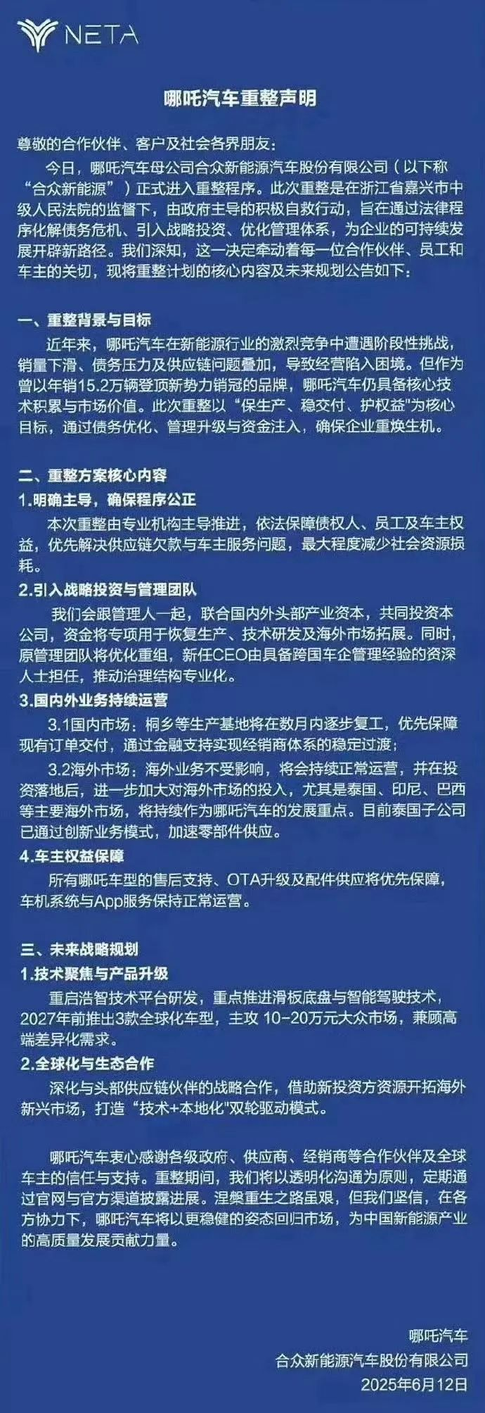 哪吒此前尝试通过债转股方式,将30 亿元供应商的欠款转化为公司股份,减轻欠债压力,争取新一轮融资,但实际仅能化解 20 亿元出头,最新一轮融资也没有进展。根据 6 月 12 日公司发布的公告,公司已经进入重整阶段,创始人、CEO 方运舟已经被罢免,新引入的 CEO 有跨国车企管理经验。
