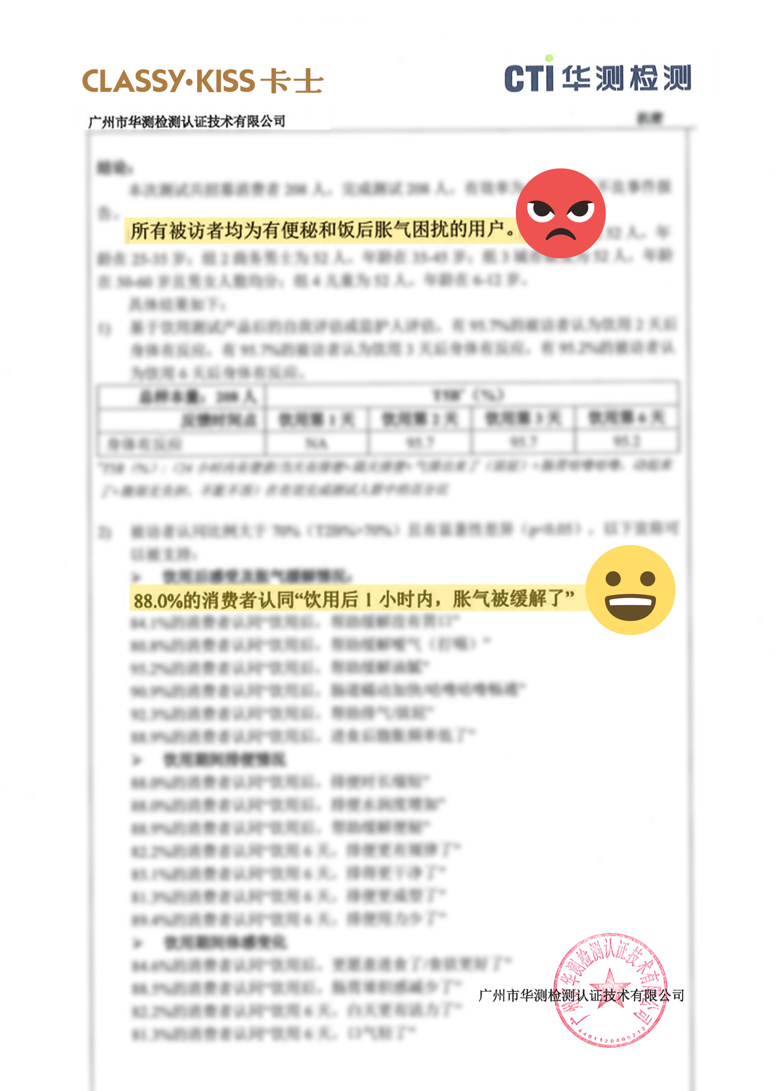 卡士餐后一小时完成了CTI华测专业测试(2025年最新),88%用户饮用后一小时之内胀气感缓解!