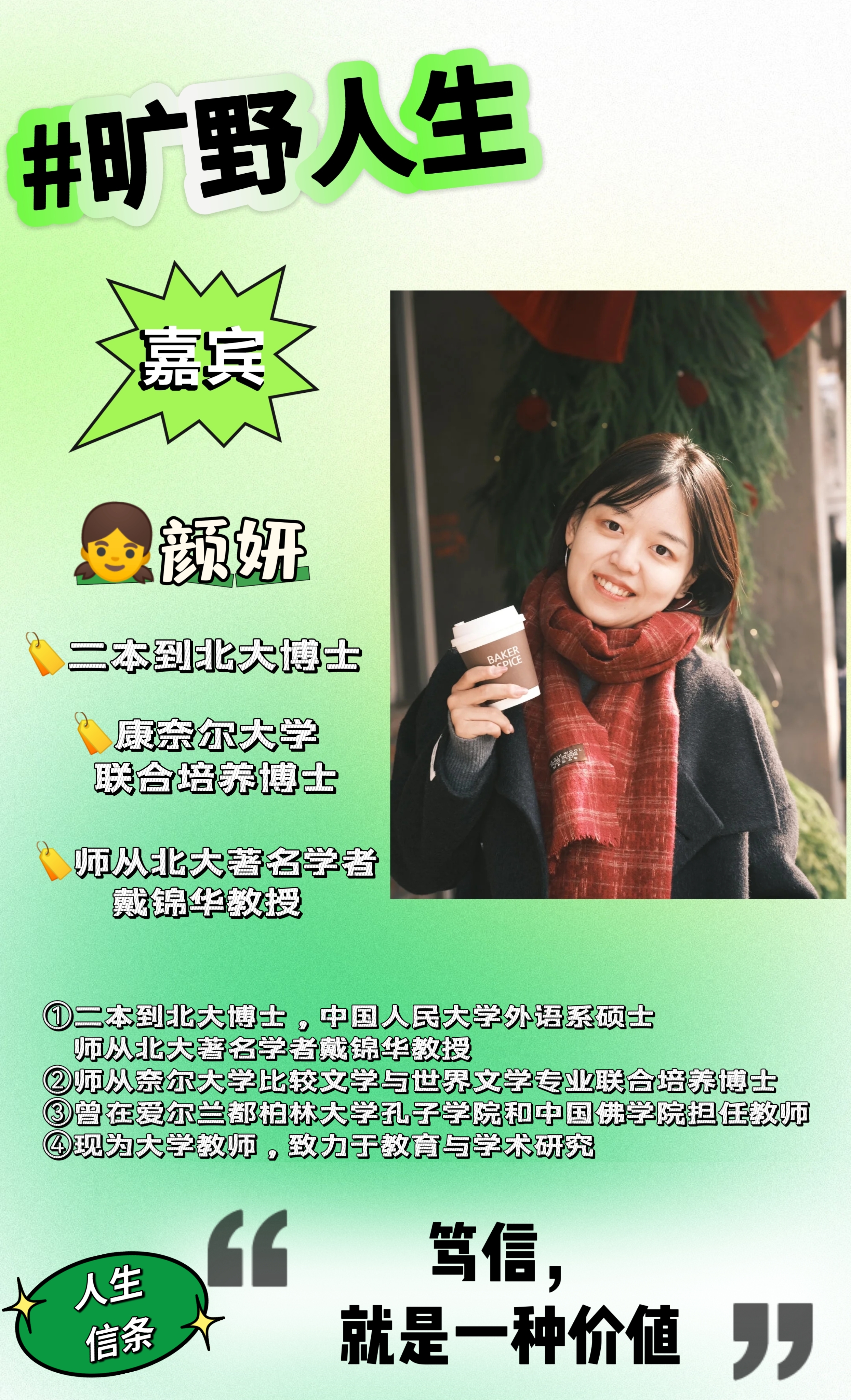 妍妍姐一路从二本到人大硕士到北大博士,读博期间师从北大著名学者戴锦华教授,曾在柏林大学和中国佛学院担任教师,现为大学教师,致力于教育与学术研究。