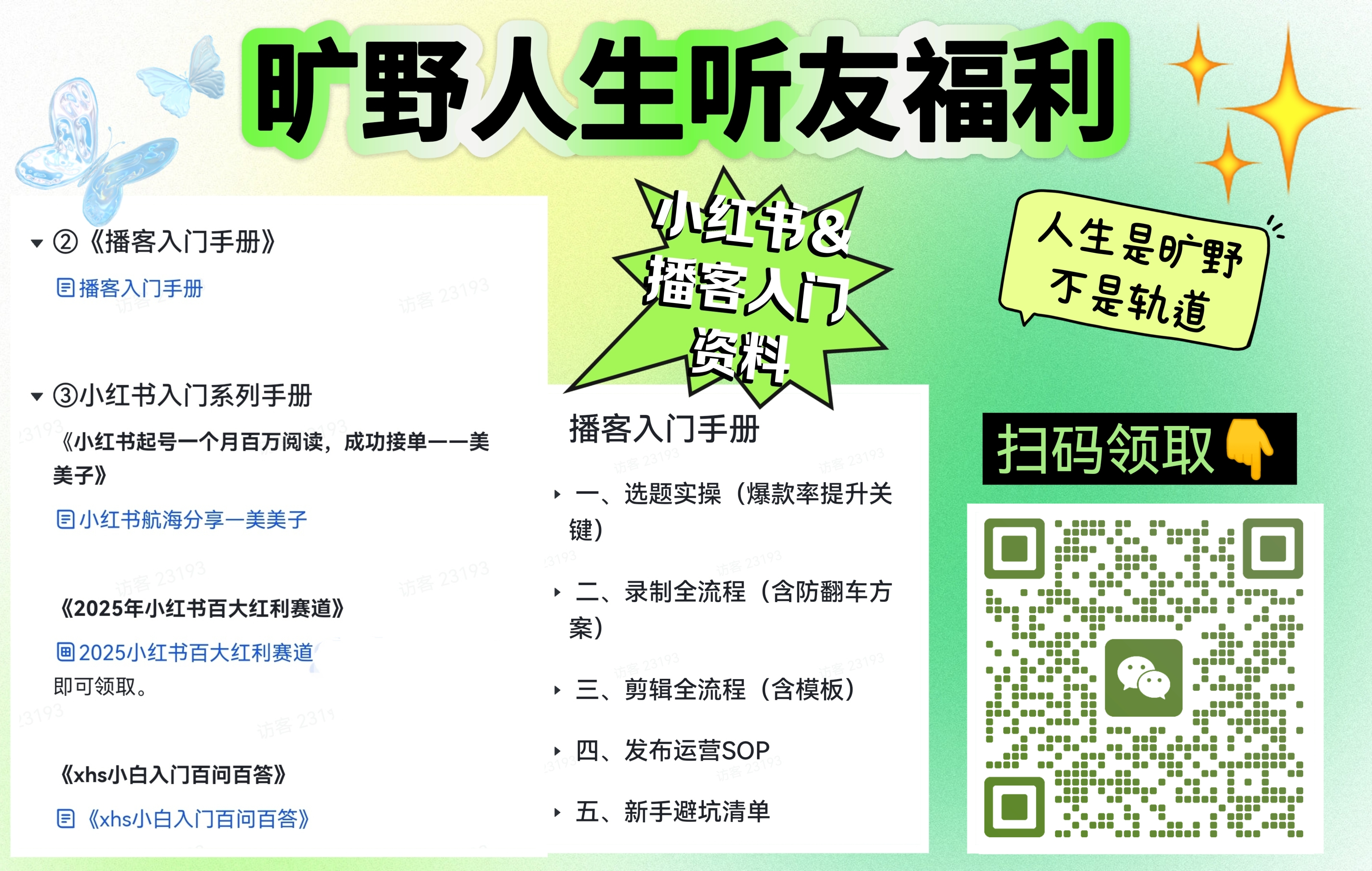 听友限定内部资料:小红书&播客入门资料包,扫码即可领取&加入高能量听友群(备注旷野人生),或者添加:kuangyerensheng888(备注:旷野人生)