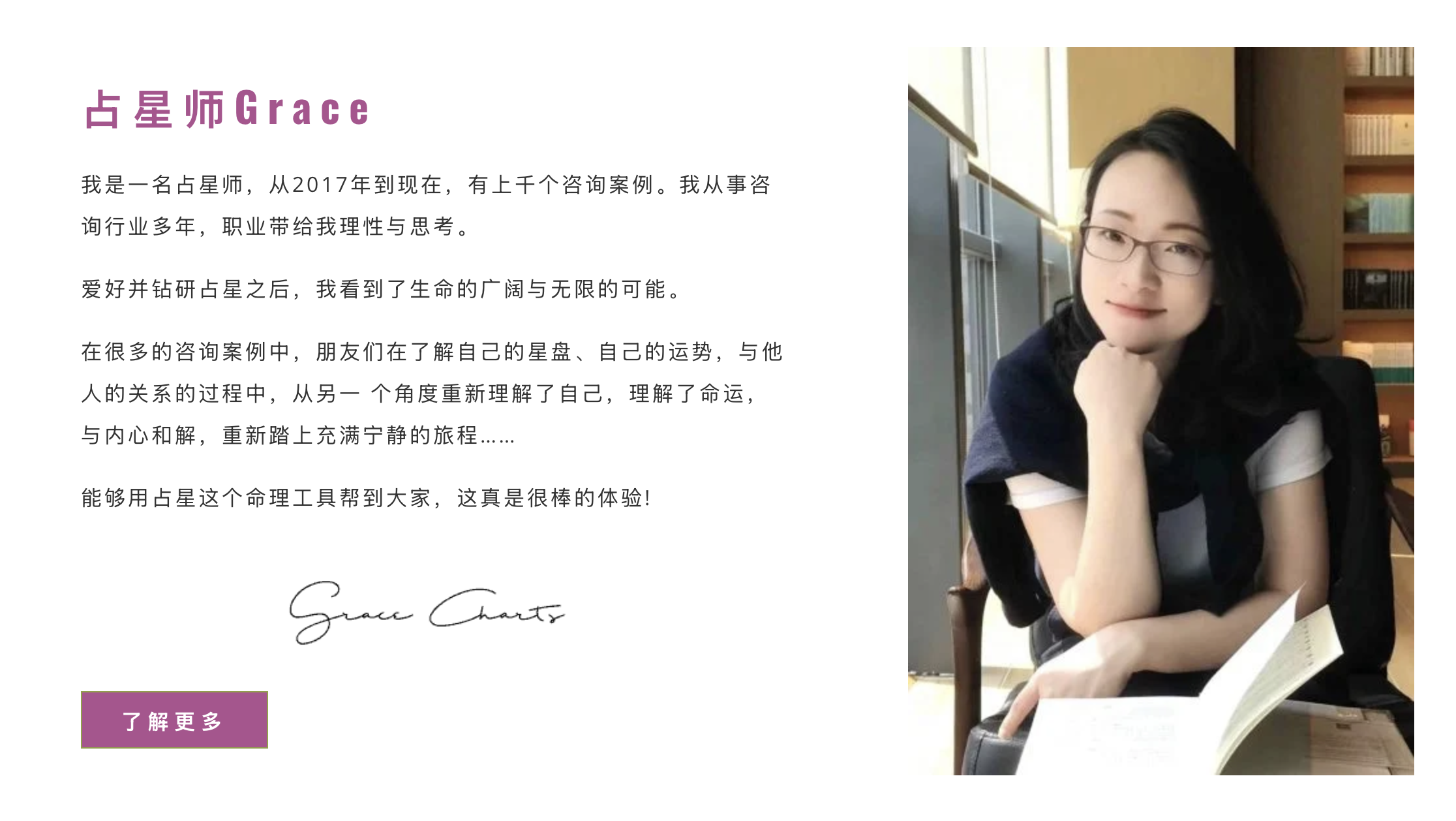 从2017年开始执业,至今已有上千个咨询案例。在成为占星师之前,我在咨询行业工作多年,这段经历让我能够更理性、更专业地解读星盘。