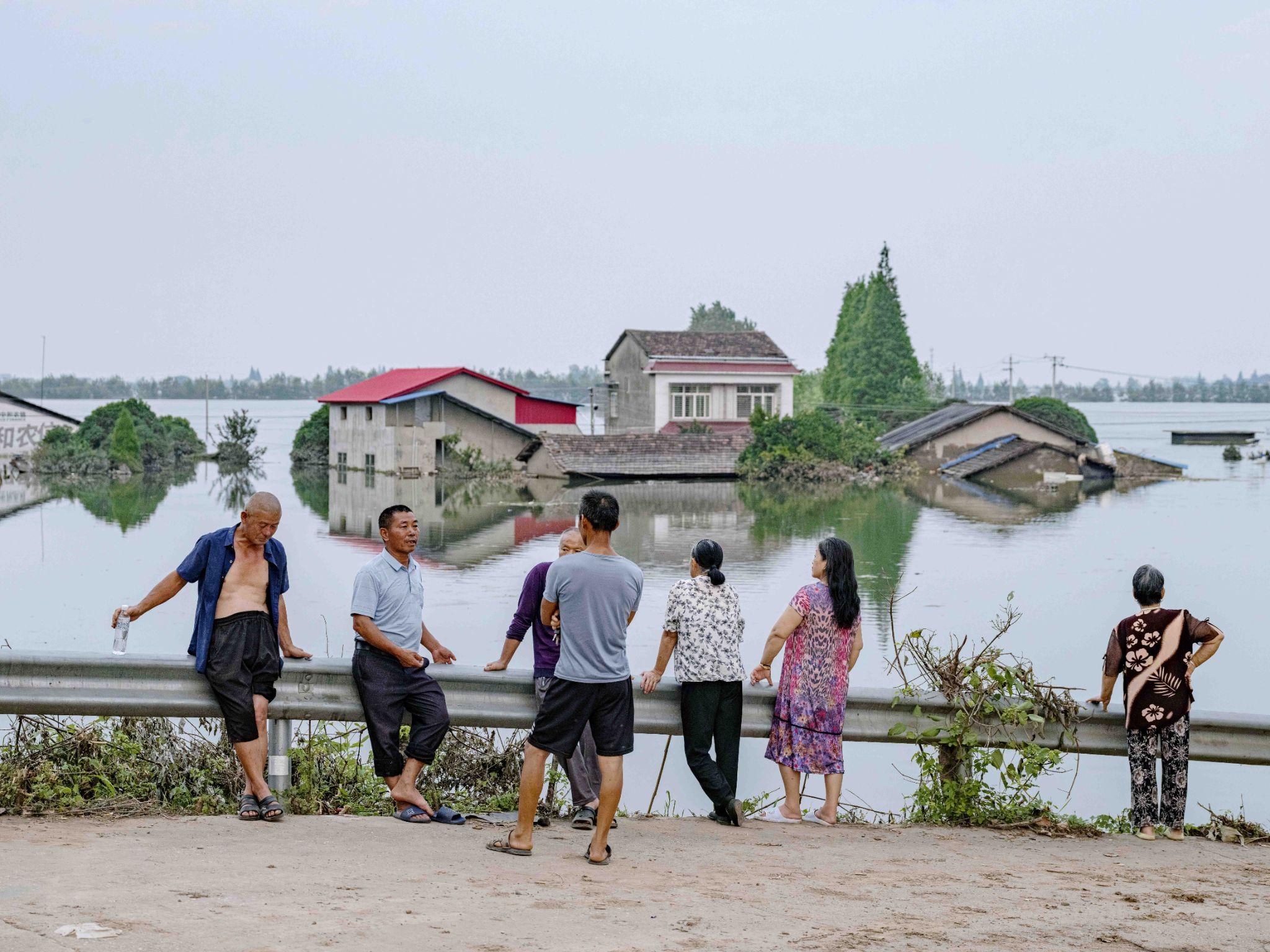 2025年7月,岳阳团洲垸被洞庭湖水淹没的村庄,8月,灾后的村民饭后到堤坝上散步聊天。©️ Zou Biyu / Greenpeace