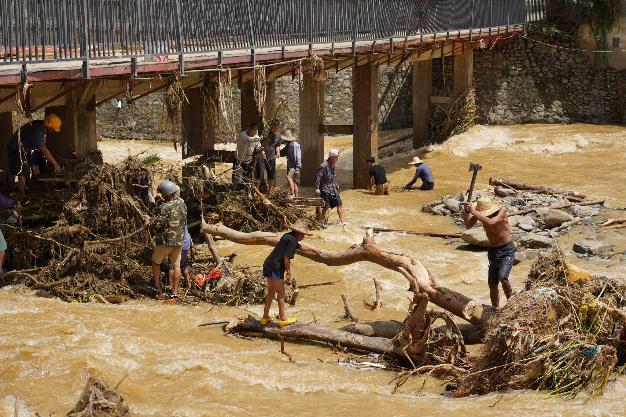 2025年7月3日广西隆林县,村民自发在河道清淤,以防入村桥梁被冲垮。©️ Zhao Yushun / Greenpeace