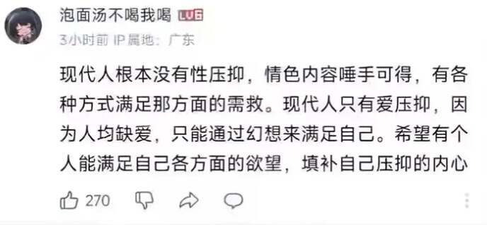 现代人当然还有性压抑,很多擦边内容都是这种压抑的衍生物,性压抑也一度成为我用来解释很多行为的动机。