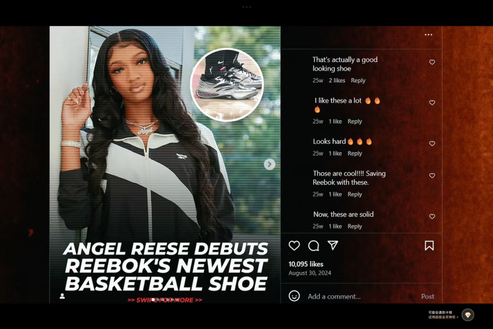 10. 片中展示了Engine A的首秀,Angel Reese上脚后在社交媒体上获得关注。(当然,品牌肯定是提前铺排好媒体造势的,套路。)