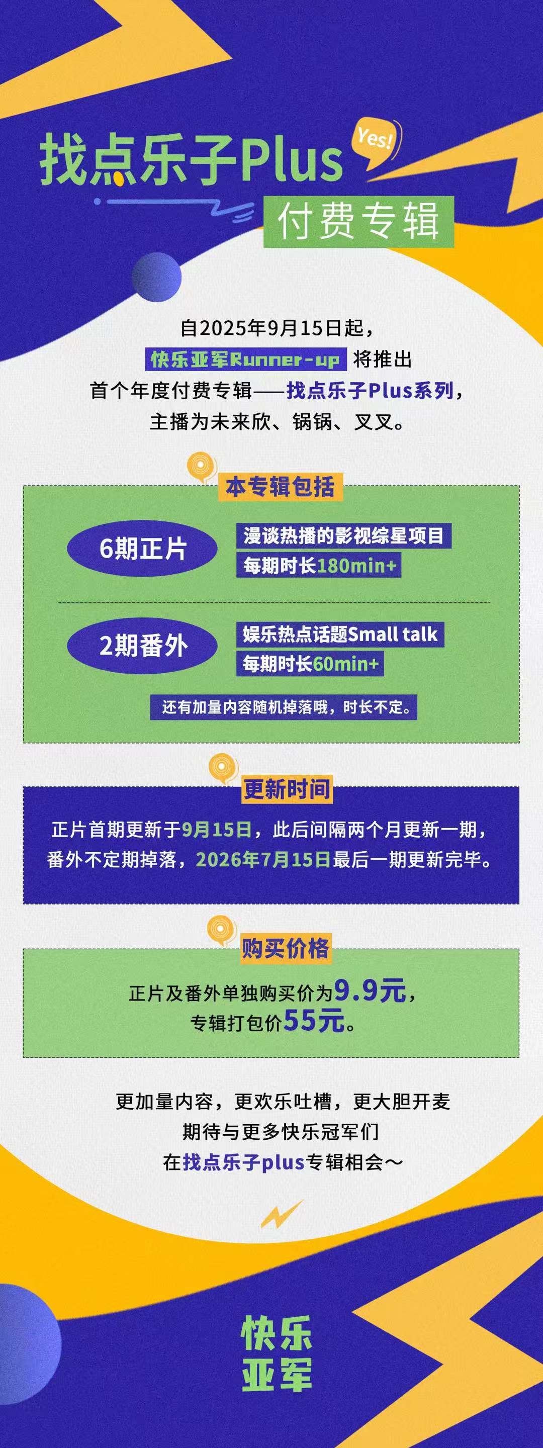感谢快乐冠军们的收听,欢迎大家关注我们节目的官方微博@快乐亚军runner-up;也可以添加小助手平章的wx:yiqimoyu8,进群找我们玩耍;商务合作请加wx: alicia955,注明品牌及来意。最后如果大家可以给我们打赏,那将是对我们最大的鼓励,真诚鞠躬。