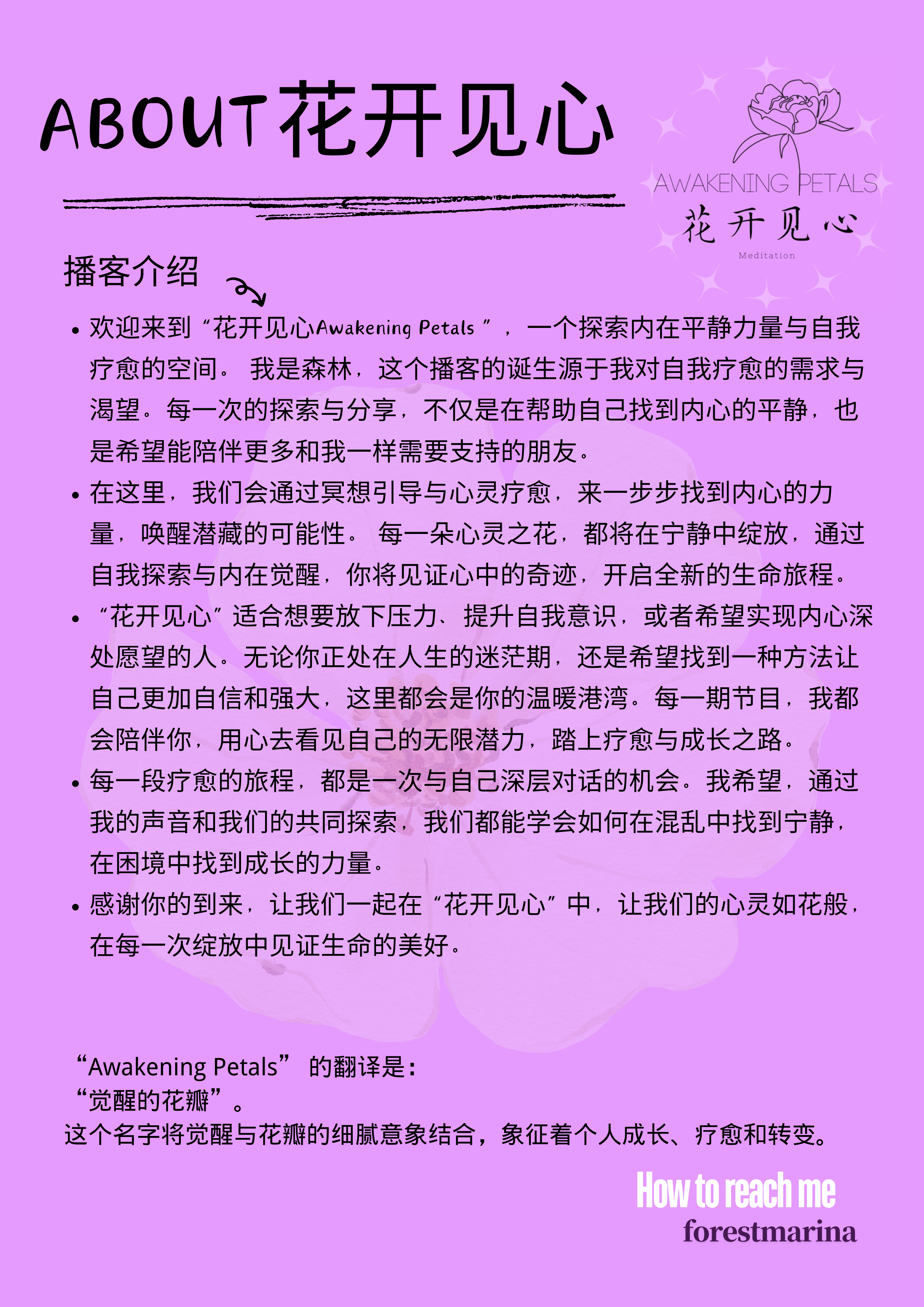 在这期冥想里,我会陪你安静下来,先与内心对话,再唤醒身体的能量。通过呼吸、意象与正念引导,让你从停滞中走向流动,从焦虑中回到当下。