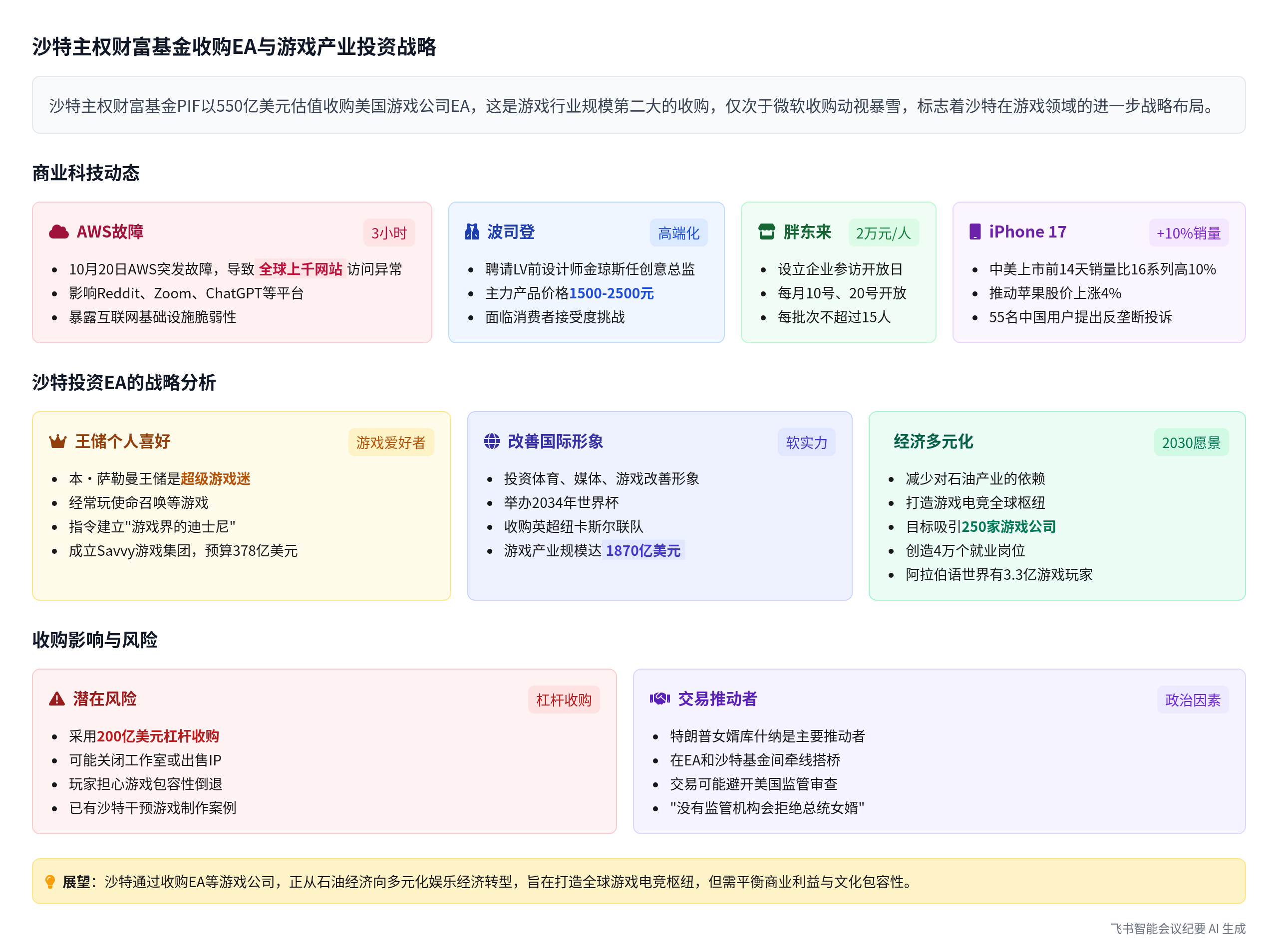 飞书智能会议纪要能力,近期已全面更新,首次实现了会议纪要「可视化」。会议后,AI可以精准的理解会议内容,用一张图带你理顺会议框架逻辑,并用图表清晰直观地展现重点内容。下面展示的图片,就是使用飞书智能会议纪要功能,用AI自动生成的本期早咖啡内容小结,你可以清晰的看见节目报道的主体,以及核心信息点。如果你也想体验飞书智能会议纪要功能,点击链接🔗,即可申请 1 个月的免费使用额度。