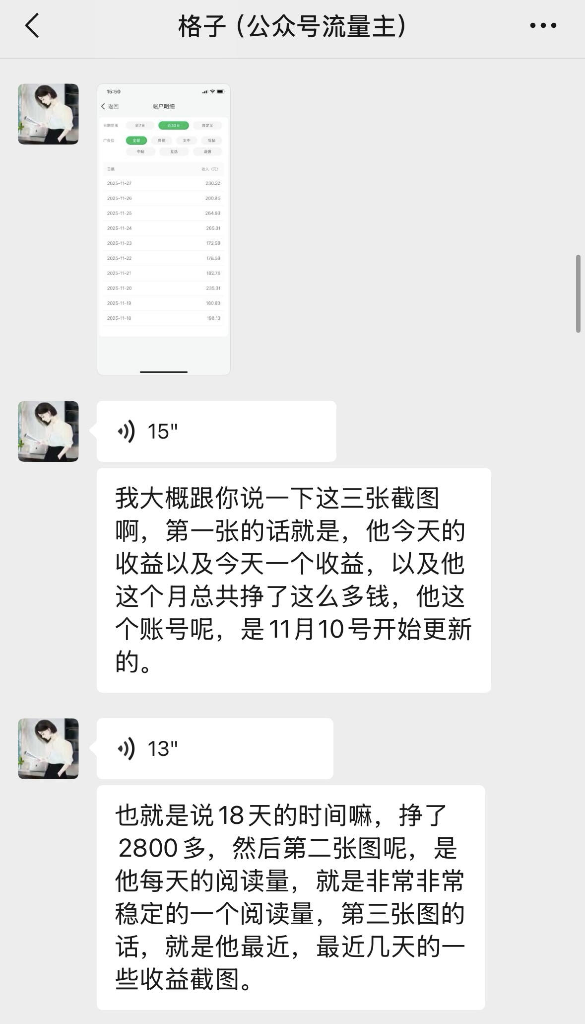 妥妥:从文字爱好切入,听播客学公众号流量主,付费跟着格子实操,18 天赚 2890 元,10 天回本学费,用真实经历证明普通人能靠文字搞钱。