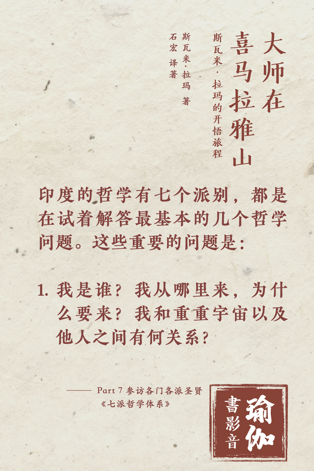 《大师在喜马拉雅山》,Swami Rama 借由拜访学术届大师的故事,为我们分享了七个哲学派别的异同,言简意骇,可以作为哲学知识的扫盲入门讯息😏