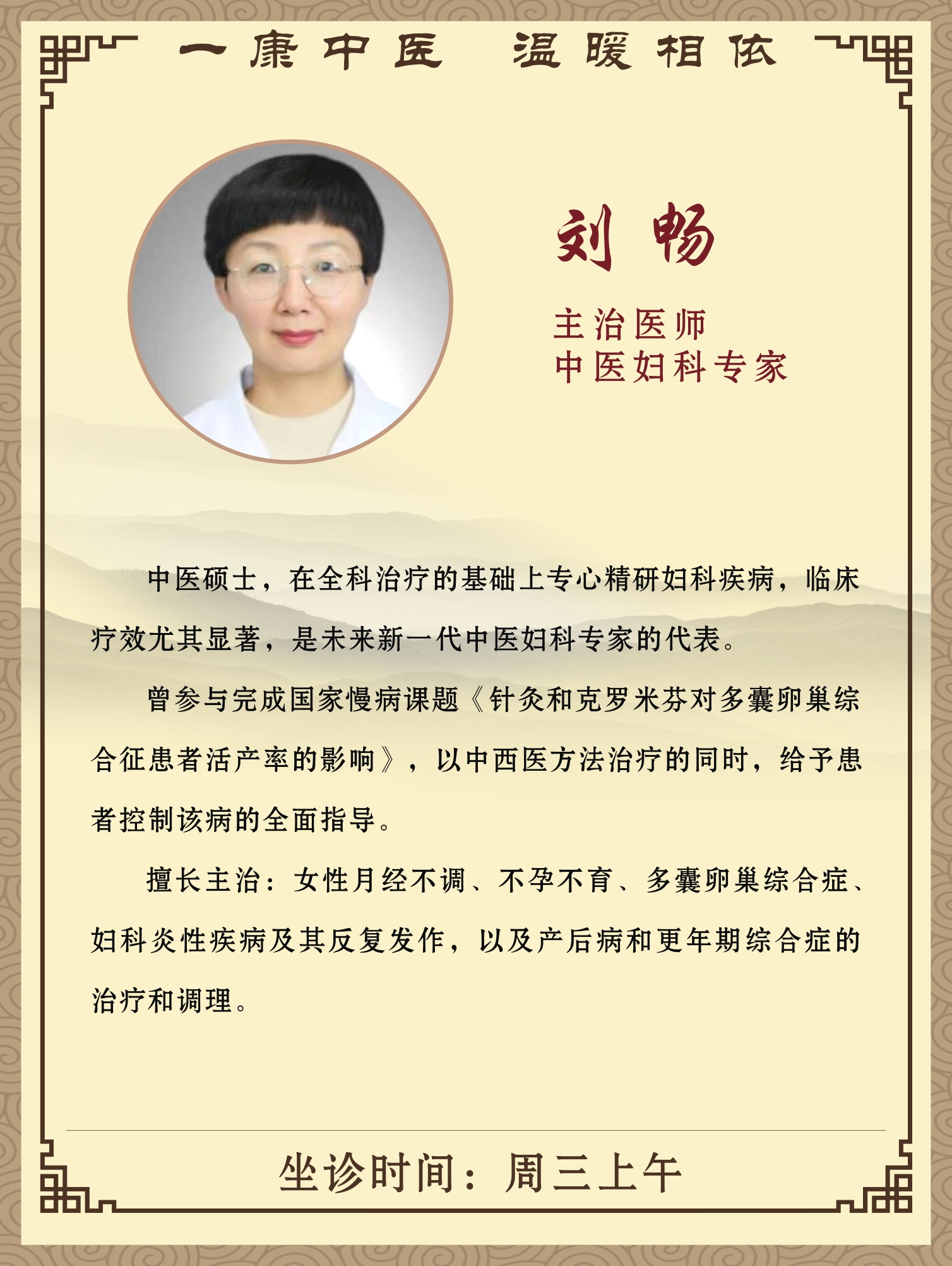刘畅:杭州良渚一康中医馆主治医师,中医妇科专家,在全科治疗基础上精研妇科疾病