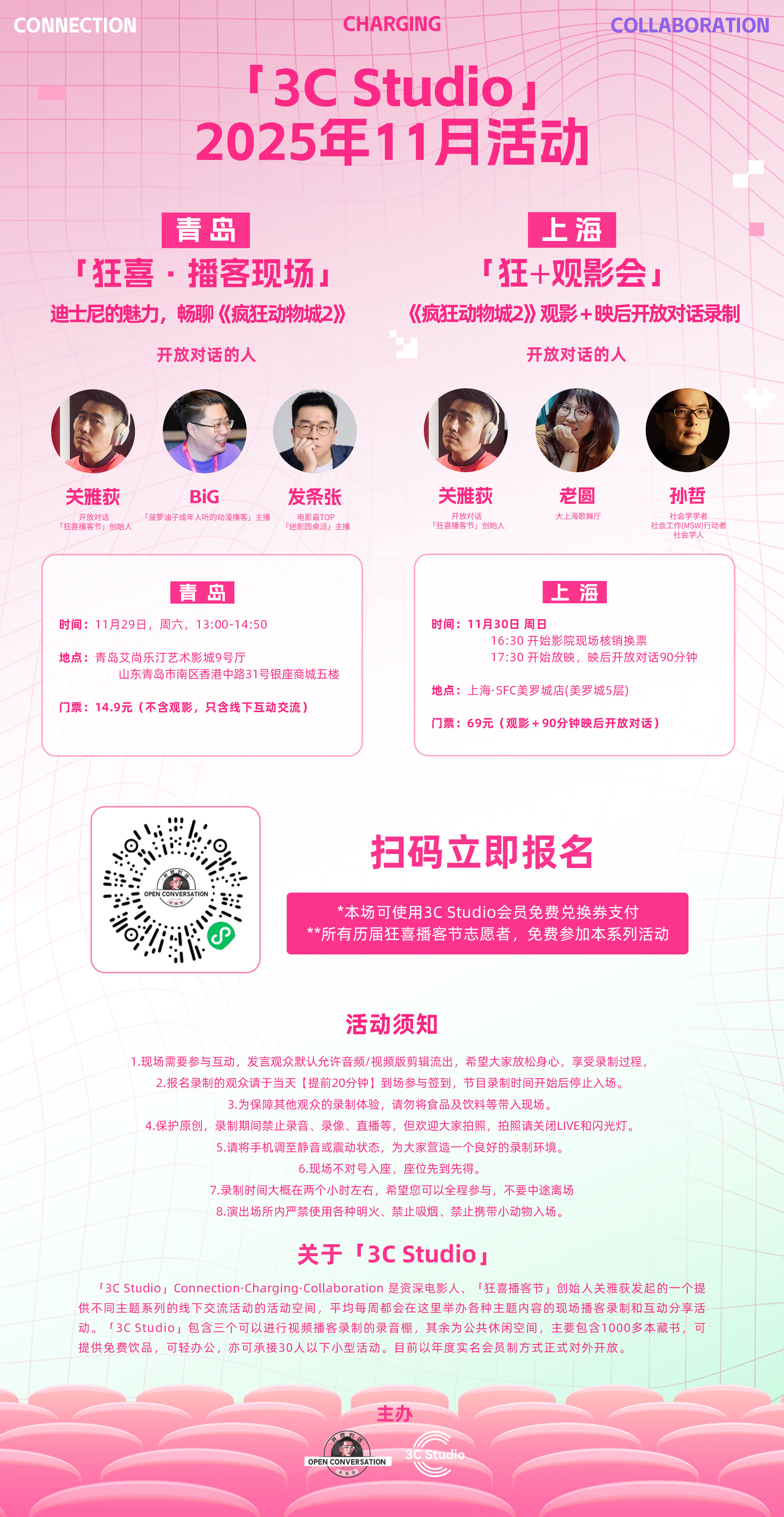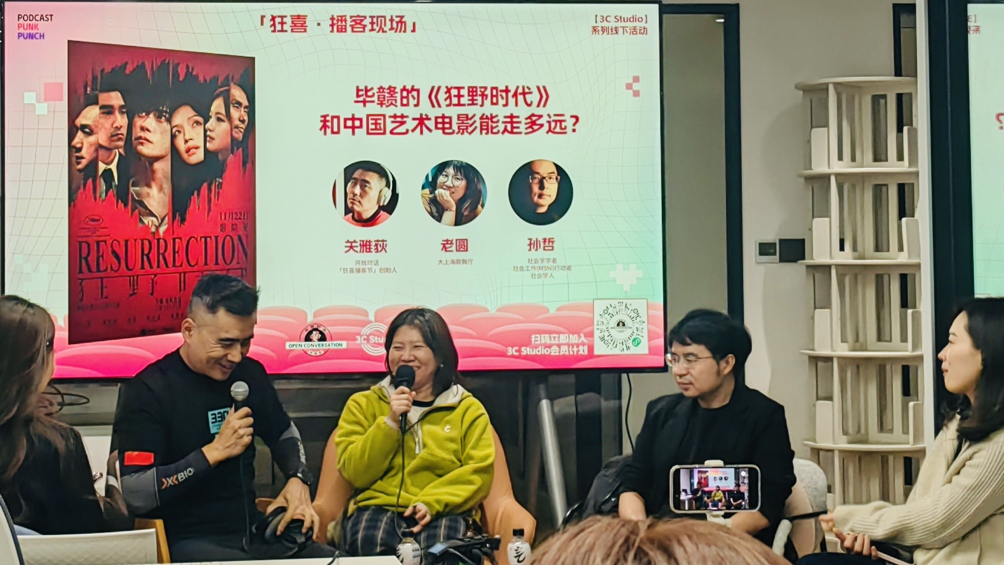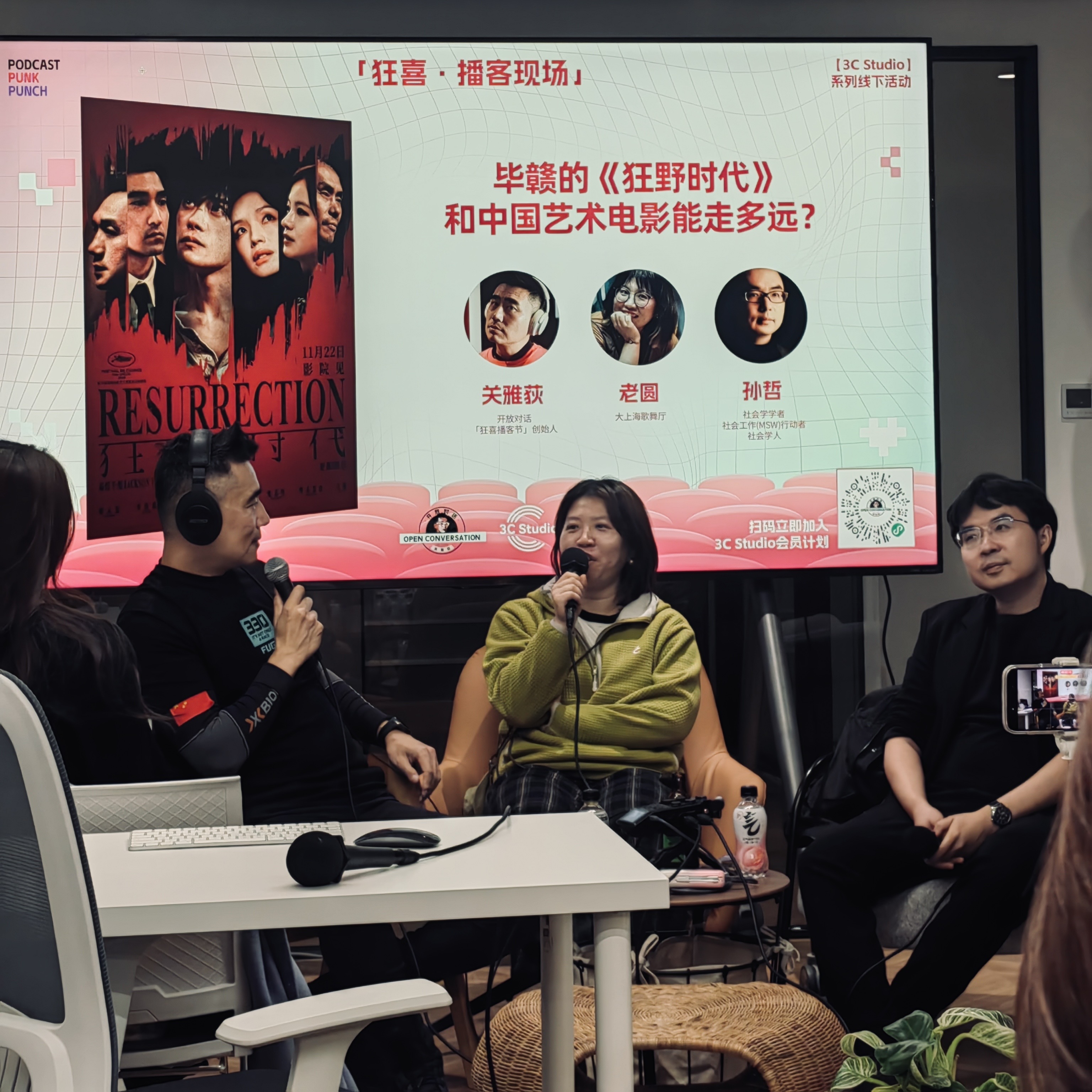 在毕赣导演的新片《狂野时代》上映首周后的周二晚上,关雅荻在其全新的3C Studio空间,邀请了《大上海歌舞厅》主播老圆和《社会学人DAO》主播孙哲,与现场观众一起展开了一场关于这部艺术电影的深度对话。这场录制既是3C Studio的首场线下活动,也成为了一次对当下中国电影现状的深刻反思。