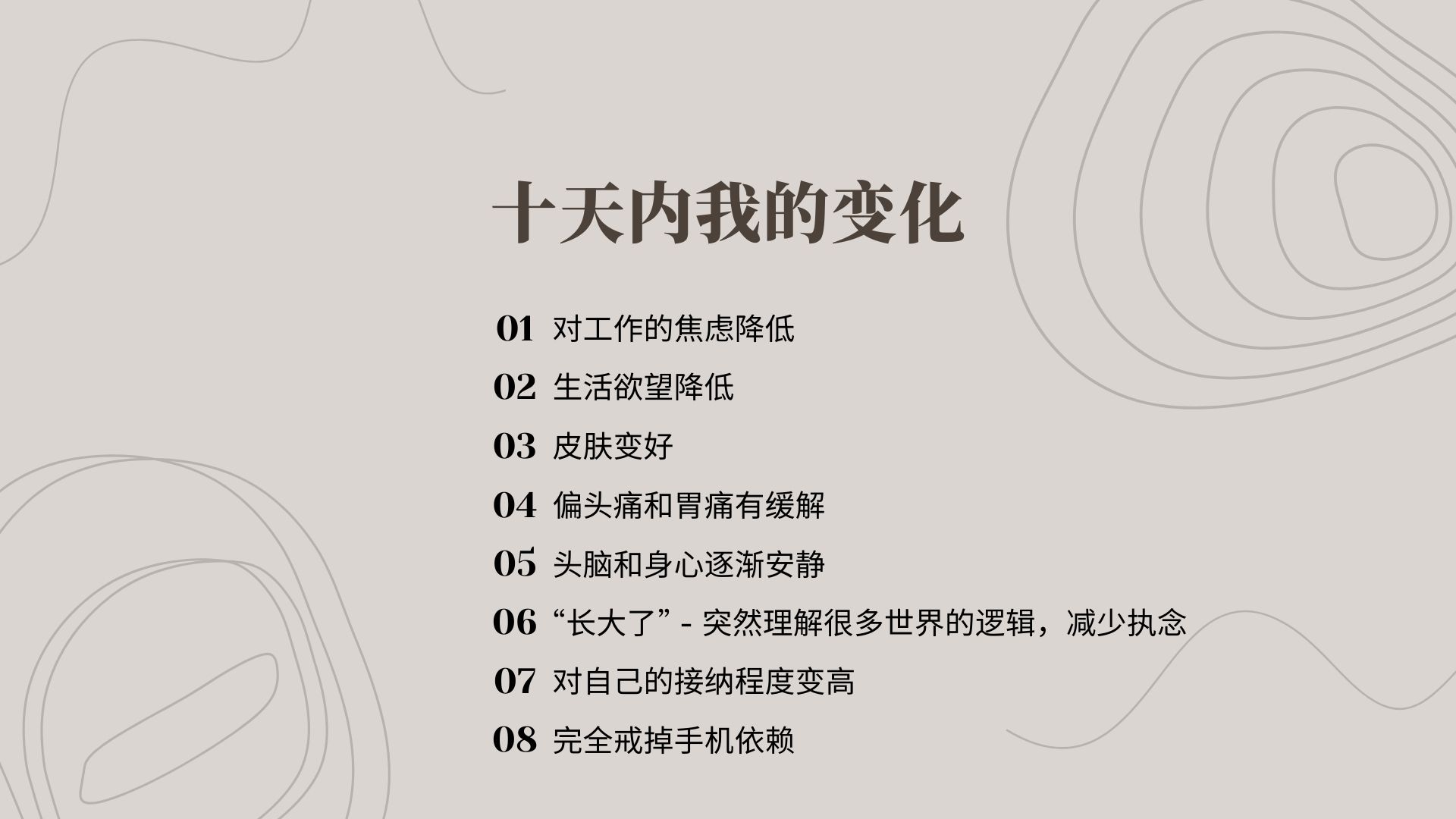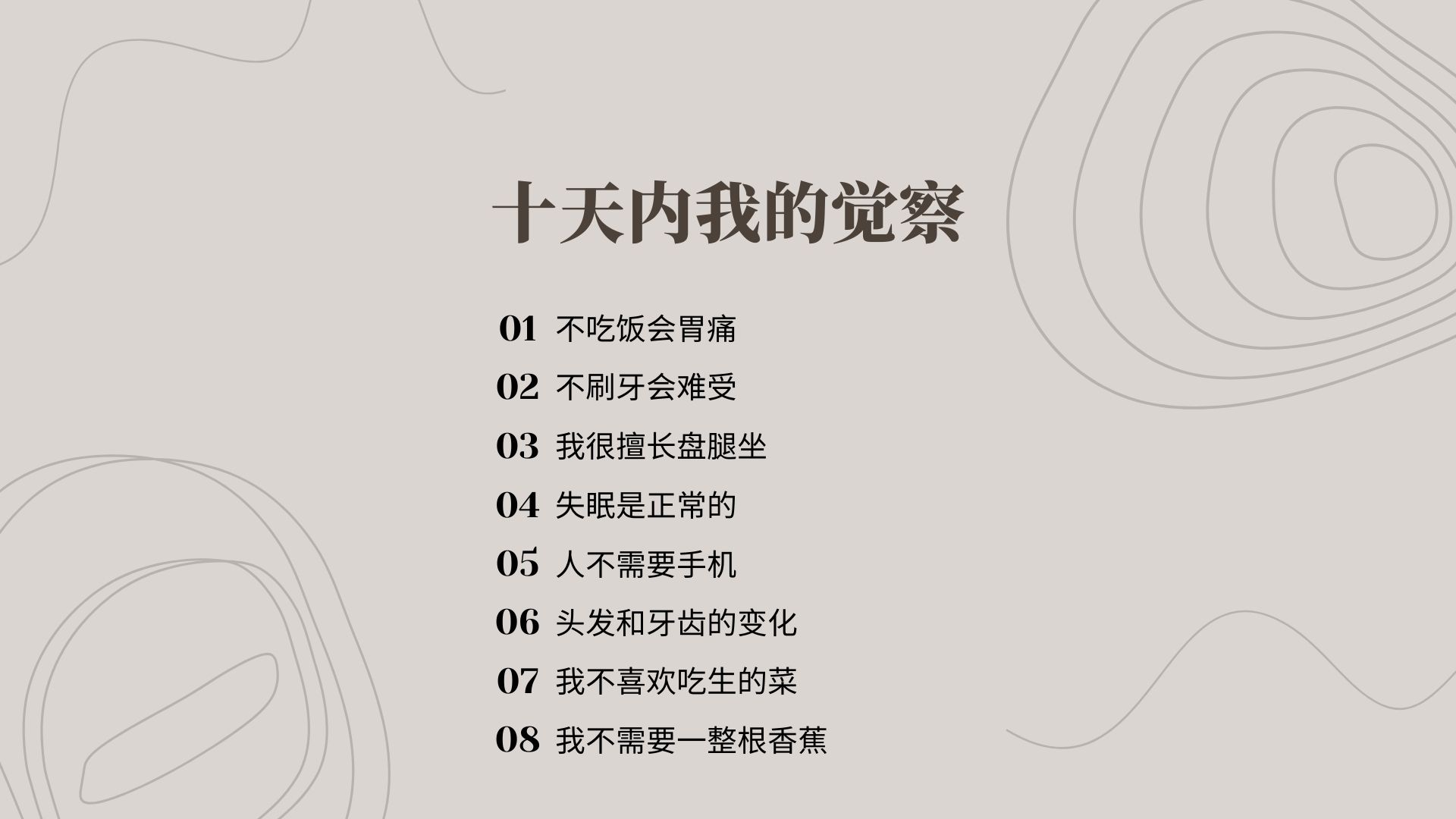 整整240个小时,不说话、不看手机、没有任何外界干扰。在那种极度的安静里,我被迫和自己最深处的恐惧面对面。我剥开了那些关于原生家庭的结、亲密关系的痛、甚至是被霸凌的记忆和对生死的困惑。