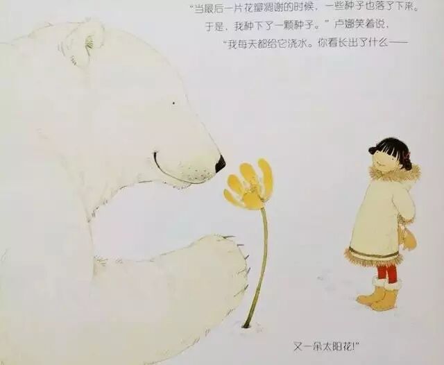卢娜和大熊生活在遥远的冰雪王国里,他们是形影不离的好朋友,一起做所有的事情,突然一天,大熊发现了一朵太阳花,送给了卢娜,可是花儿却凋谢了,卢娜很难过。为了让可爱的笑容再次回到卢娜的脸上,大熊踏上了寻找太阳花的旅程,历尽千辛万苦可什么都没有找到,此时的卢娜非常想念她的好朋友大熊。当两个好朋友再次见面的时候,卢娜告诉大熊,他就是卢娜最好的礼物,好朋友在一起最重要,同时,在那朵太阳花凋谢的时候,卢娜收集了花种子,这些花种子在两个好朋友的悉心照料下,开出了一大片的太阳花。