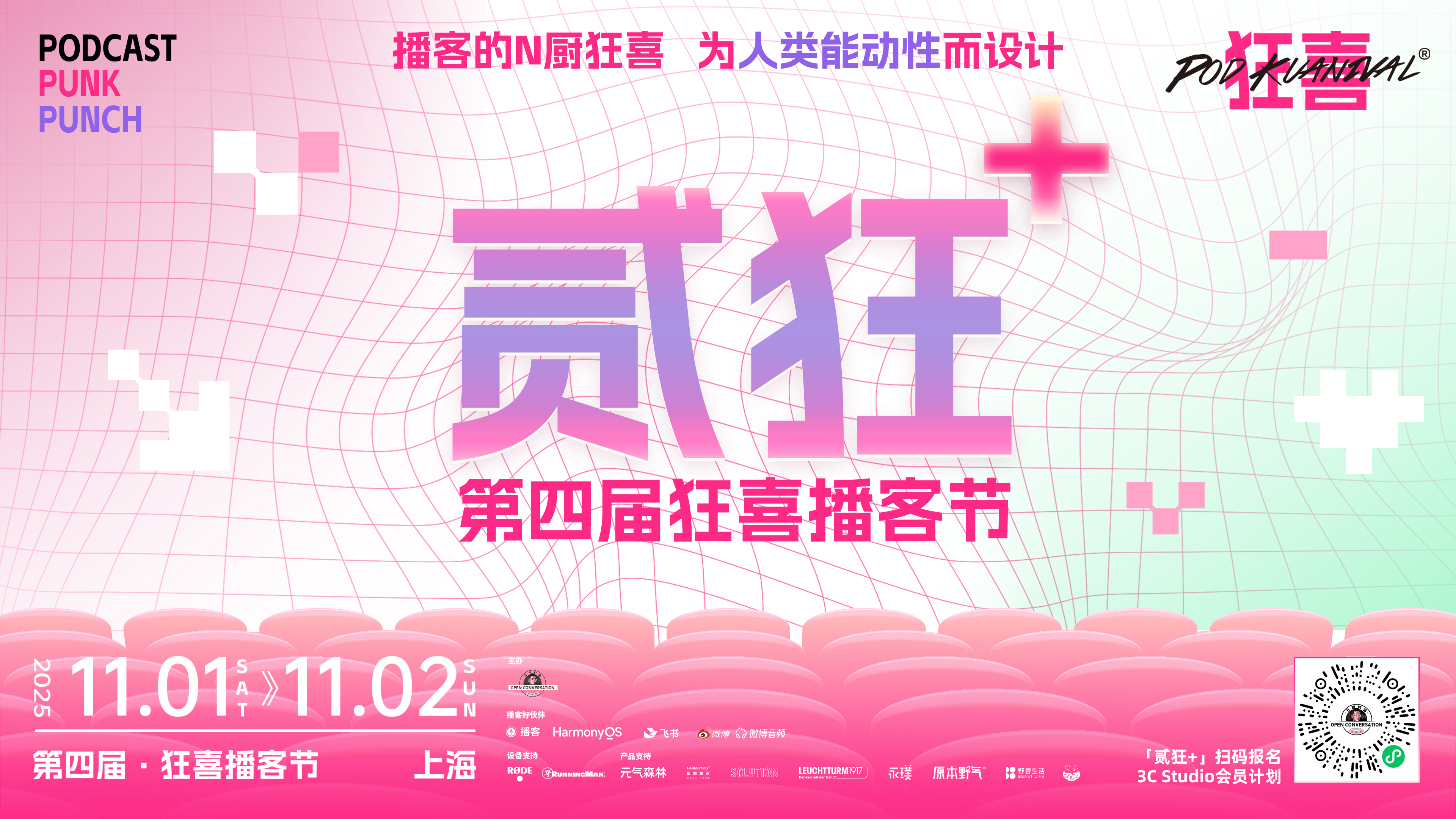 (第四届“狂喜”播客节主视觉海报,可储存图片扫码报名)