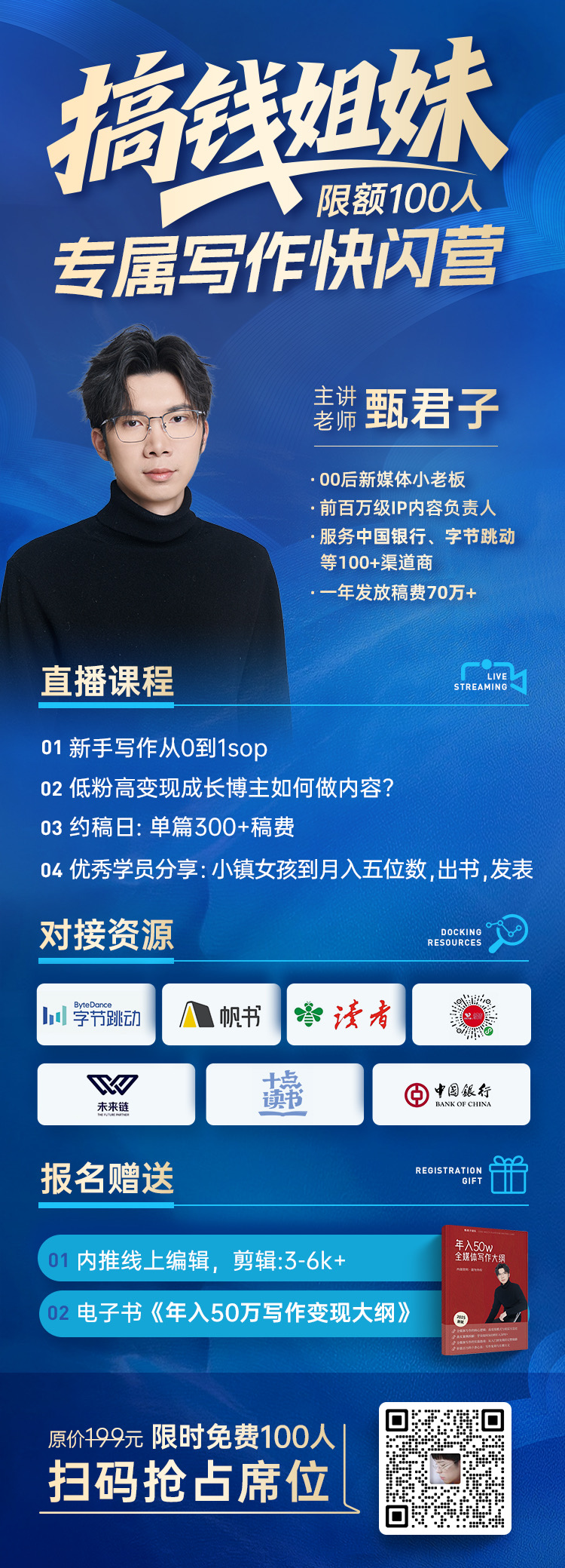 今天不仅要扒君子老师从专科生到年入百万的逆袭全路径,还要到了他给咱们听友的独家福利 —— 价值 199 元的写作快闪营,免费开放前 100 个名额!需要的姐妹评论区扣“写作快闪营”,然后添加我们的小助手圆圆,就能轻松领取!(圆圆的联系方式就在shownotes里,快去扫码添加吧!)别犹豫,搞钱要快,手慢则无,只有100个免费名额!另外,如果大家需要本期节目的文字稿,直接扫码购买小报童领取呀~