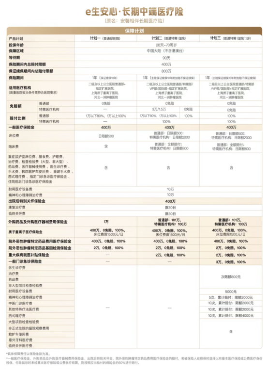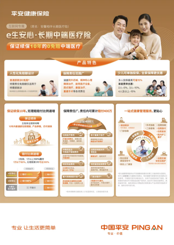 平安e生安心·长期中高端医疗险,保证续保10年的0免赔中端医疗。
