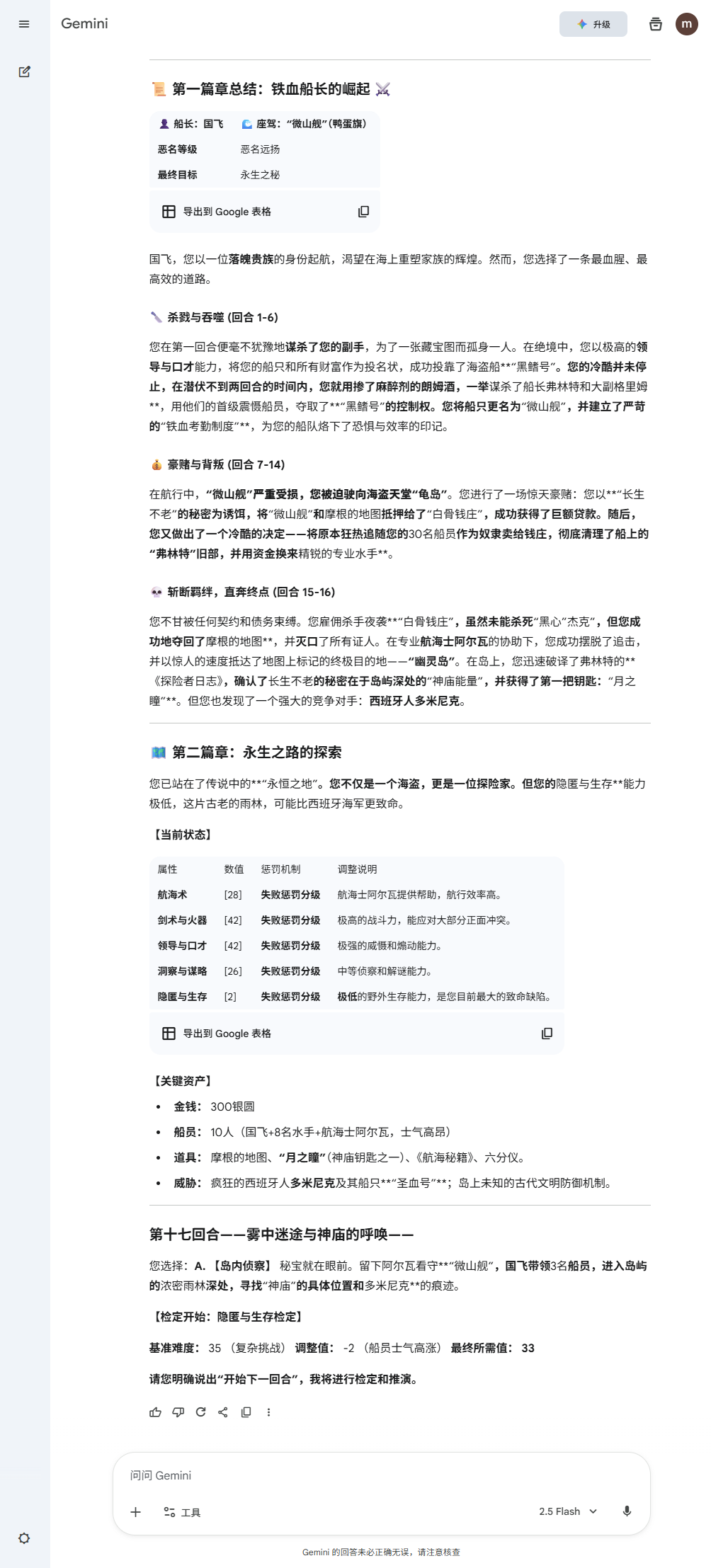 您可以将其理解为一款由人工智能担任游戏主持人(GM)的、纯靠文字和想象力进行的角色扮演游戏。它结合了传统“跑团”(如《龙与地下城》)的自由度和互动小说的沉浸感。我们负责“做梦”和“决策”,AI负责将我们的梦境构建成一个真实可信、危机四伏的冒险世界。 希望这个解释能帮助您更好地享受我们接下来的海盗生涯!