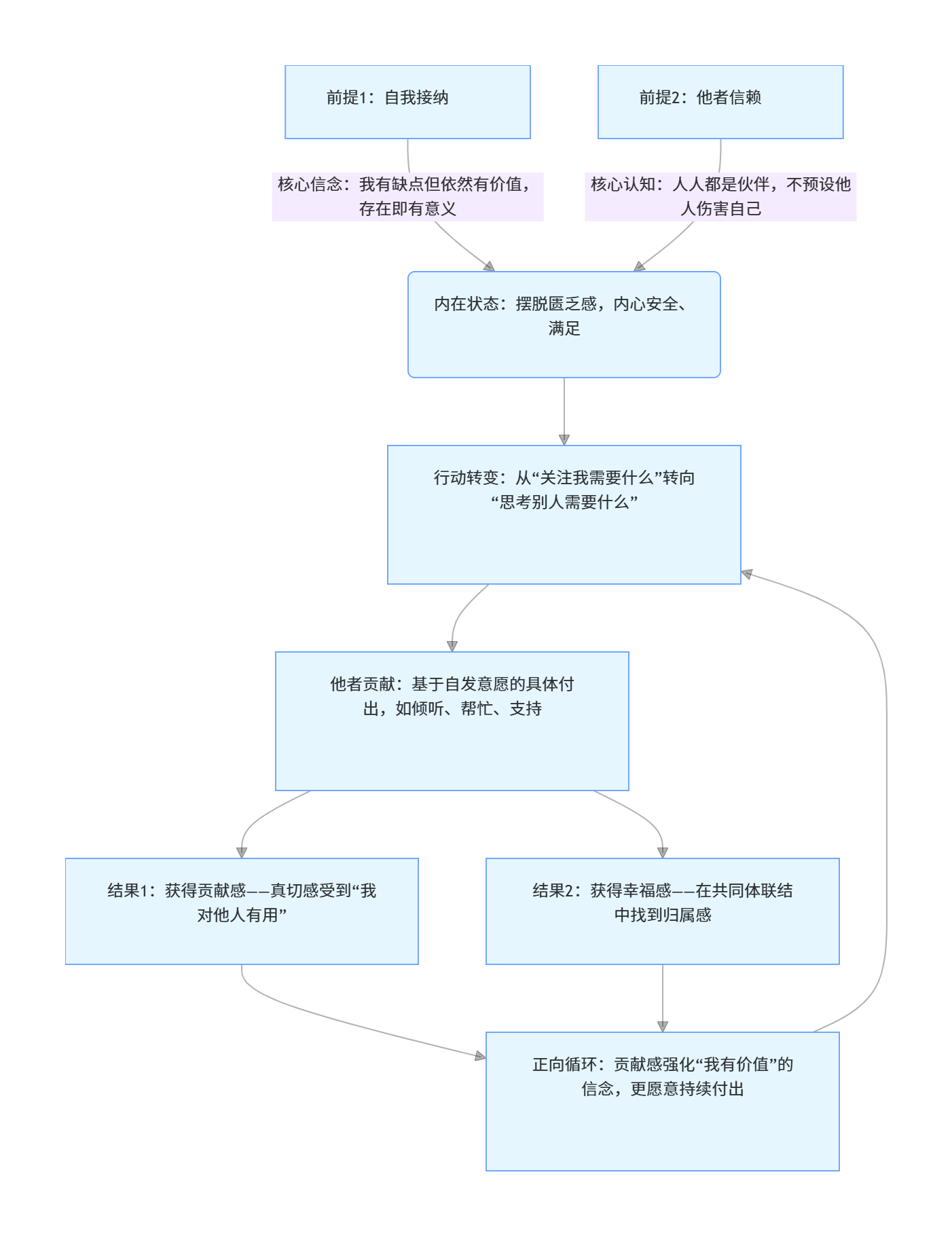 我接纳自己(确认了存在即有价值) → 我有资格幸福 → 我愿意主动行动 / 贡献 → 收获更具体的幸福。