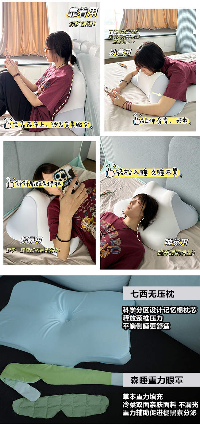 </figure>💤本期节目推荐的「七西趴靠自由枕」,可以适配各种姿势,让人自由躺着靠着趴着玩手机看书,适合喜欢葛优躺的手机党,适合孩子和老人,也对腰椎颈椎友好