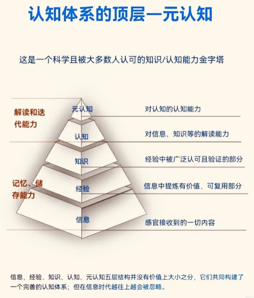 当你在思考一件事情的时候,你能意识到自己在思考;然后也能进一步意识到自己在思考什么;再接着呢,还能进一步的跳脱出惯性的固有思考模式,主动选择改变自己的思考方式或者是结果,这就是元认知的能力。