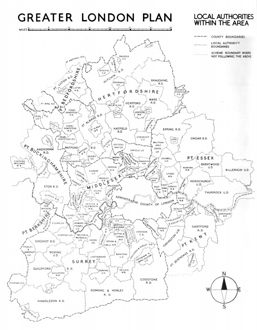 </figure>大伦敦规划所包含的地方政府范围(Greater London Plan 1944)