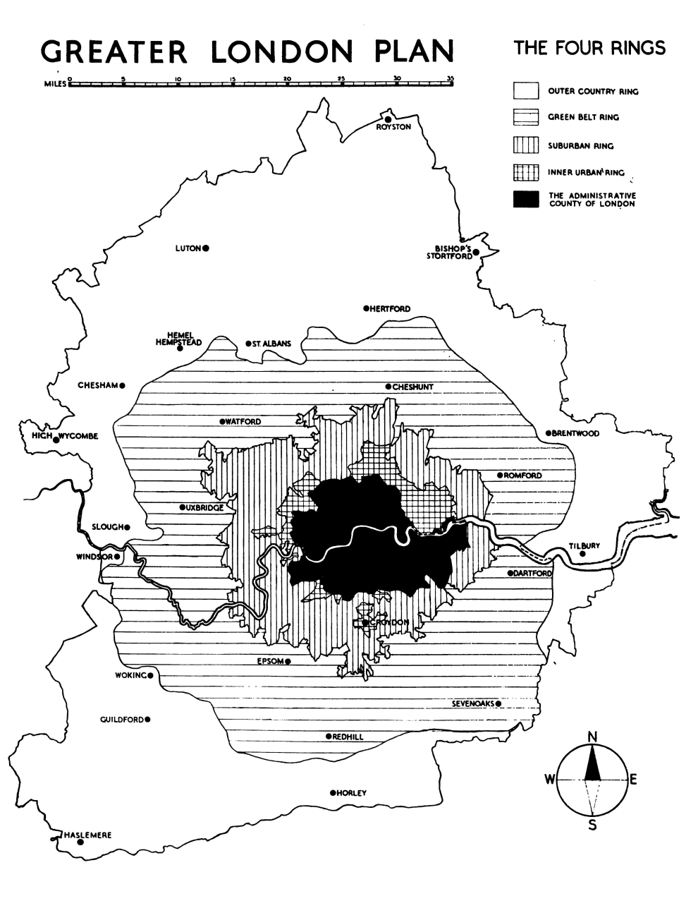 </figure>Abercrombie的大伦敦规划环状结构 (Greater London Plan 1944)