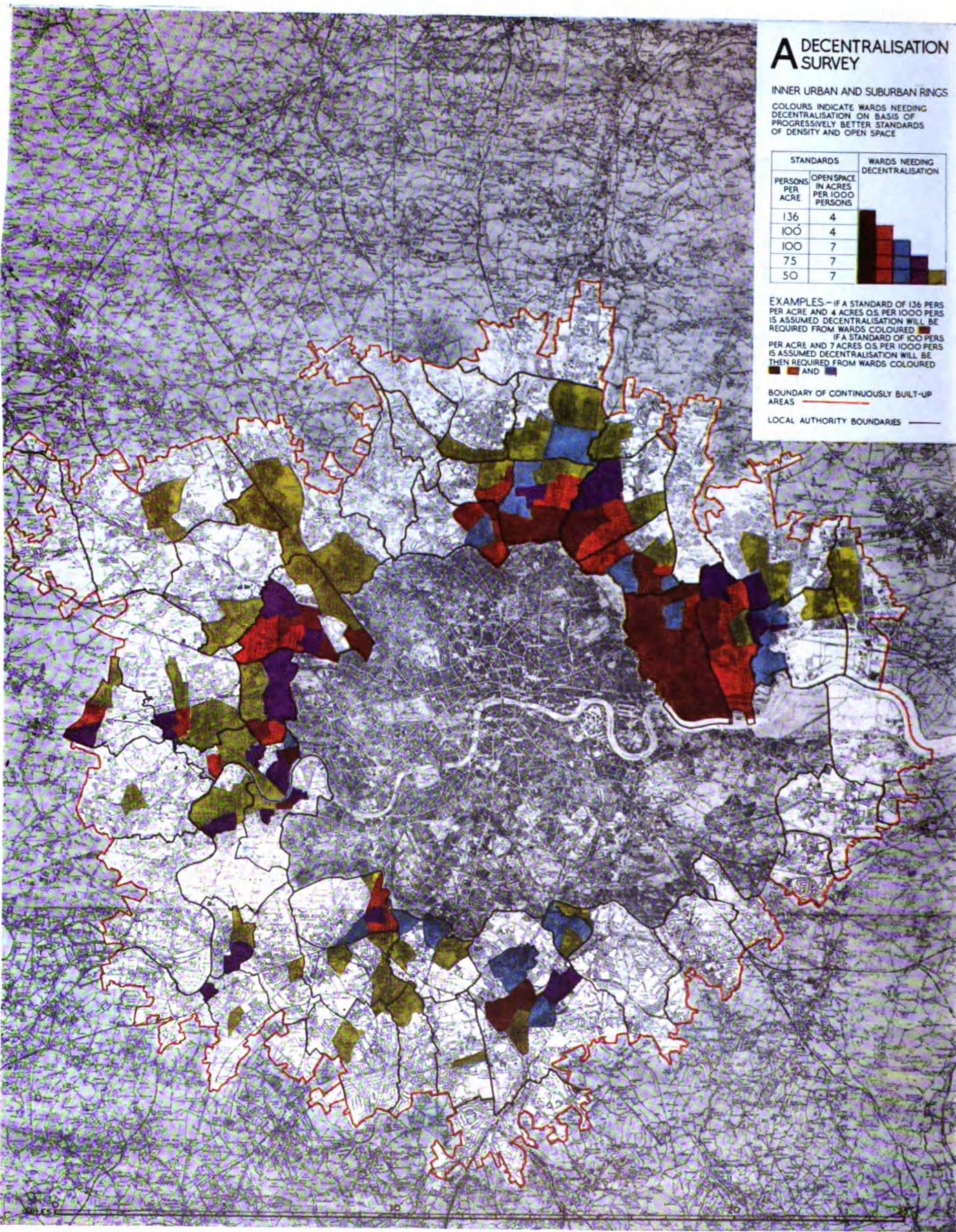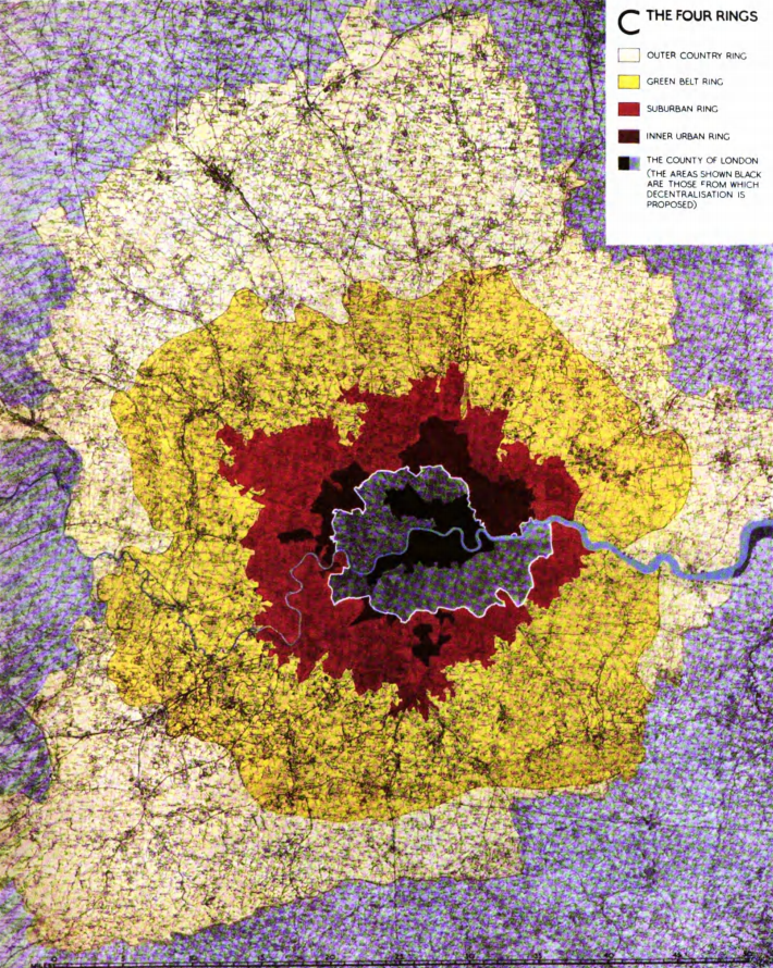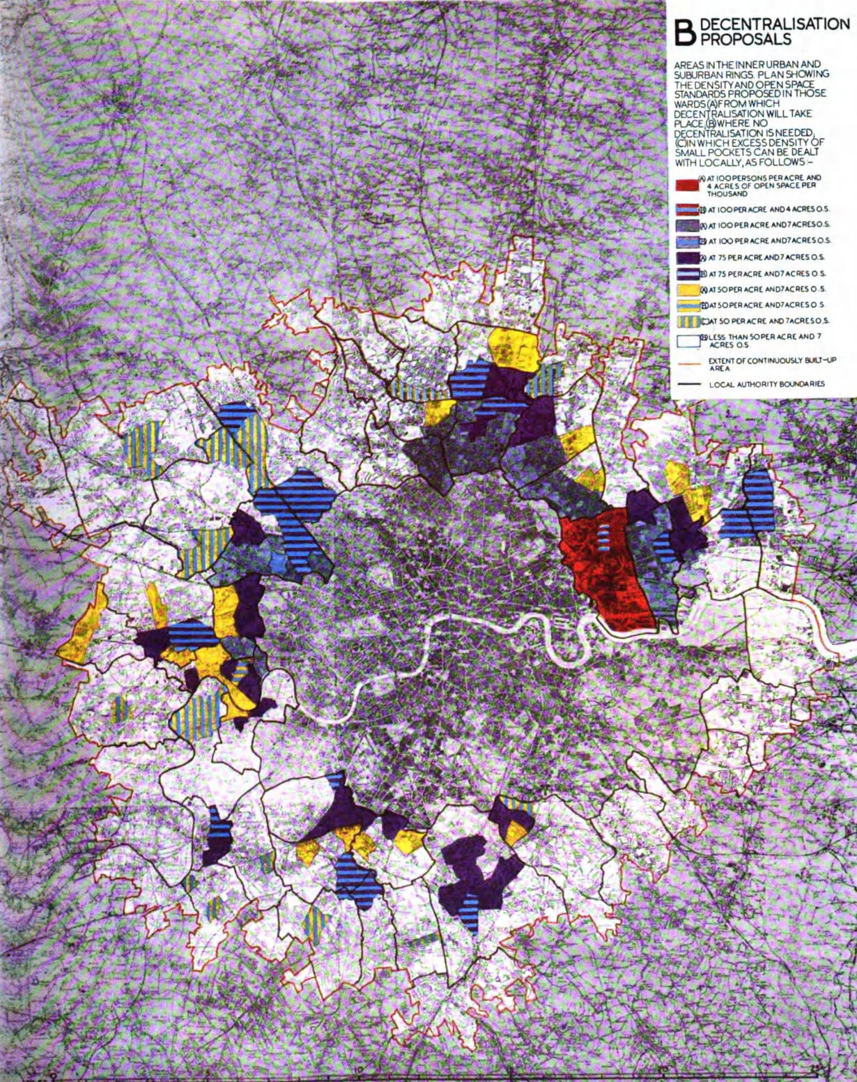 </figure>疏散计划,以人口密度为逻辑(Greater London Plan 1944)