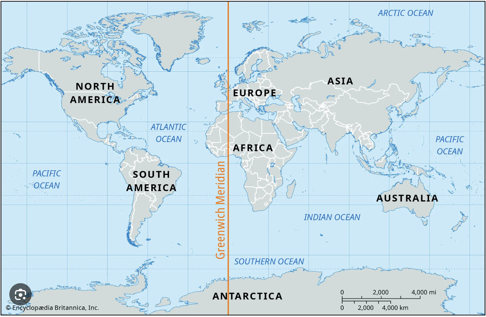 </figure>4. 通过格林威治皇家天文台的零度经线在世界地图中 (图源网络)