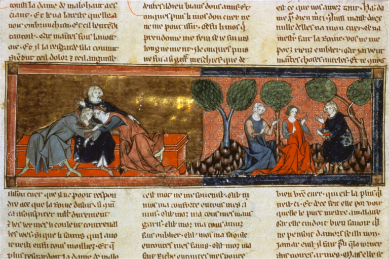 Gallehault presiding over the first kiss between Lancelot & Guinivere, Prose Lancelot. MS 805. © Pierpont Morgan Library.